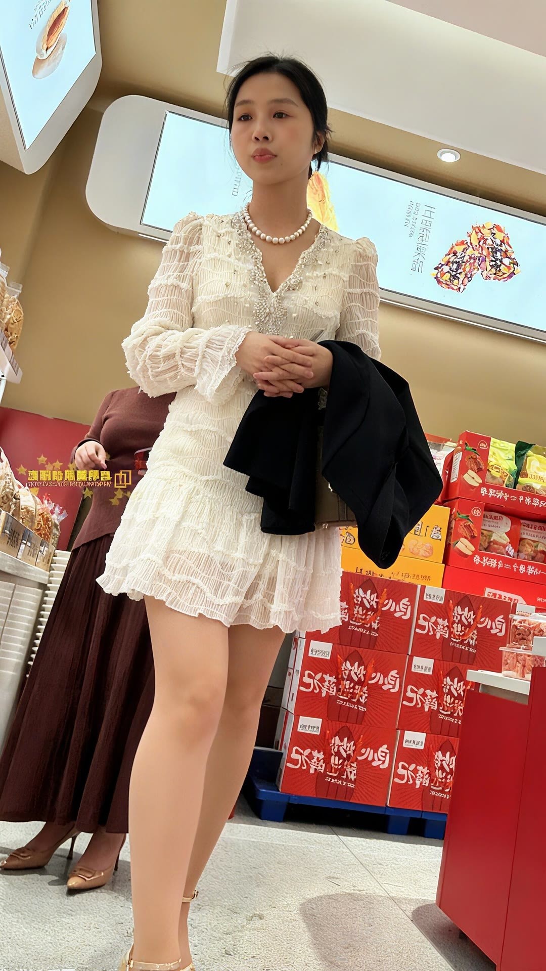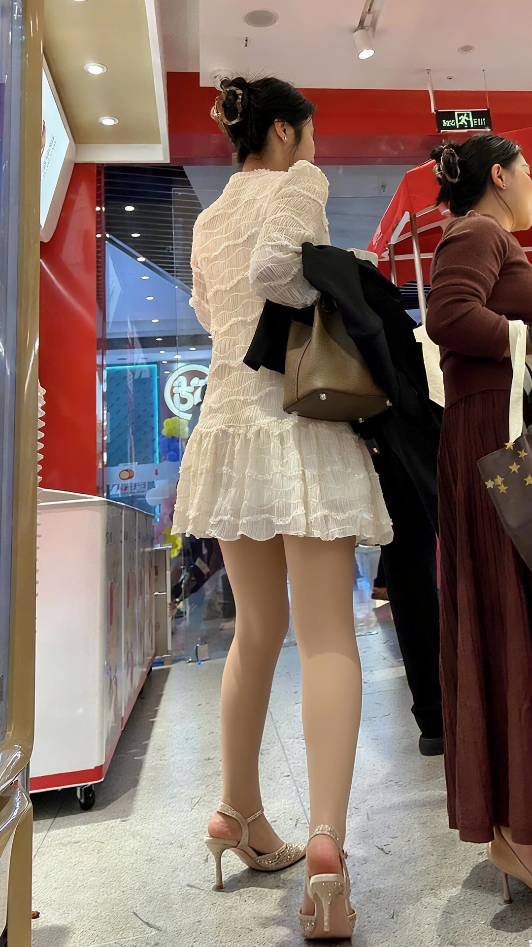 长发妹子穿紧身牛仔裤逛街。