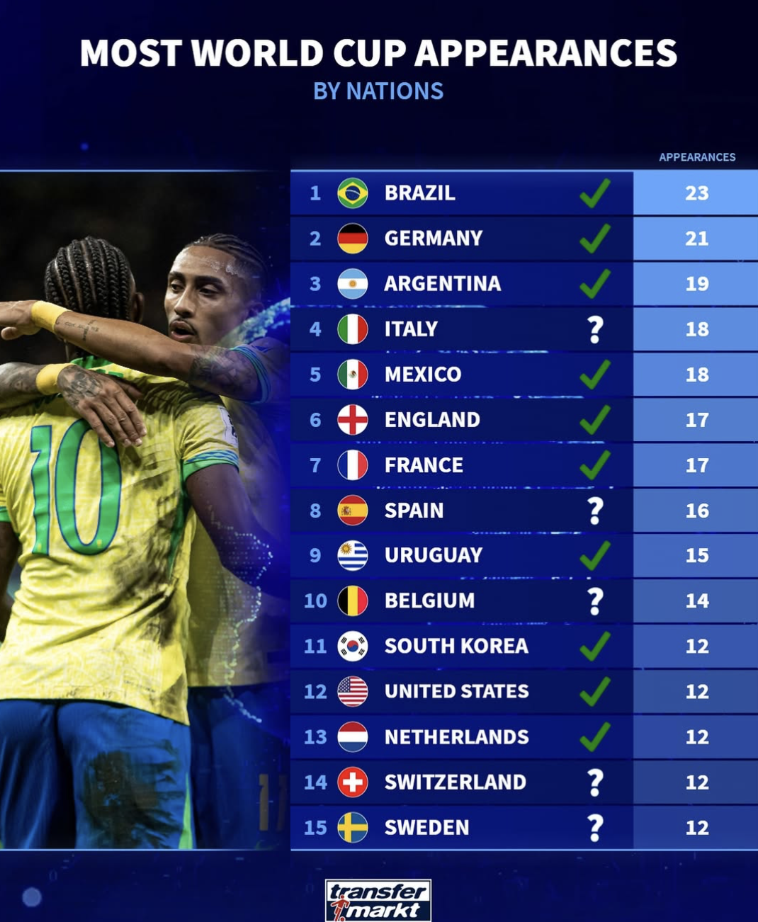 巴西队共23次,成为唯一一支从未缺席世界杯的球队,德国以21次排名第二。榜单前15名中有10个国家已经确定能参加明年的世界杯。西班牙、比利时和瑞士不出意外今晚也能出线,而意大利与瑞典则需要参加附加赛。