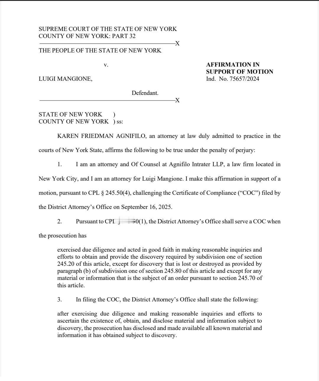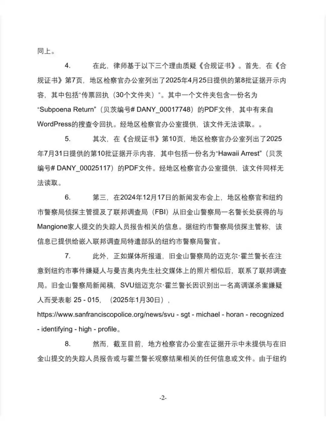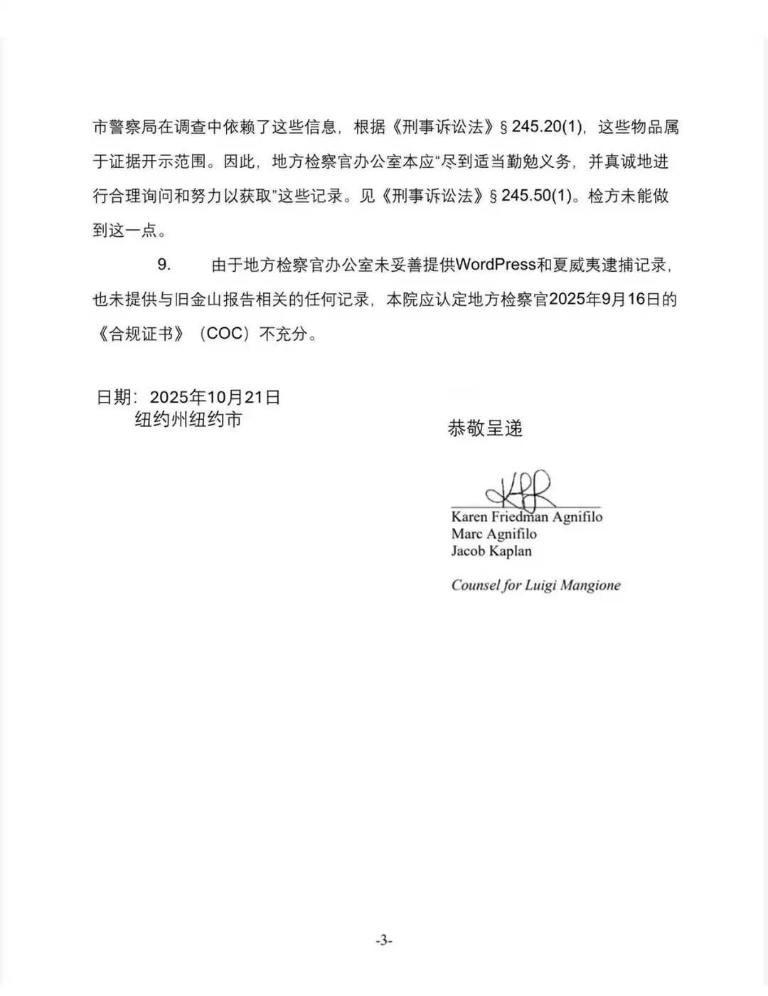 纽约州:Luigi的律师动议挑战COC Luigi Mangione的辩护律师2025.10.21日向纽约州最高法院提出动议,核心内容是挑战地区检察官办公室提交的《合规证书》(Certificate of Compliance,简称COC)的充分性 地区检察官办公室在提交合规证书时,应声明在行使了应有的谨慎并进行了合理的调查和努力,以查明、获取并披露受发现程序约束的材料和信息后,已披露并提供了所有已知的受发现程序约束的材料和信息。 挑战合规证书的理由 WordPress返回文件不可读:地区检察官办公室在2025年4月25日提供的第八批发现材料中,包含了一个名为“Wordpress Return”的PDF文件,但该文件不可读。 夏威夷逮捕文件不可读:在2025年7月31日提供的第十批发现材料中,包含了一个名为“Hawaii Arrest”的PDF文件,同样不可读。 未提供旧金山失踪报告及相关观察记录:地区检察官办公室未提供与Mangione家族在旧金山提交的失踪人员报告相关的任何信息或文件,也未提供旧金山警察局Michael Horan警官关于纽约市事件嫌疑人与Mangione社交媒体照片相似性的观察记录。尽管NYPD在调查中依赖了这些信息,但地区检察官办公室未行使应有的谨慎并真诚地进行合理的调查和努力来获取这些记录。 动议请求 由于地区检察官办公室未妥善提供WordPress和夏威夷逮捕记录,且未提供与旧金山报告相关的任何记录,法院应认定地区检察官办公室于2025年9月16日提交的合规证书不充分。 英文原件见附件 Luigi LuigiMangione