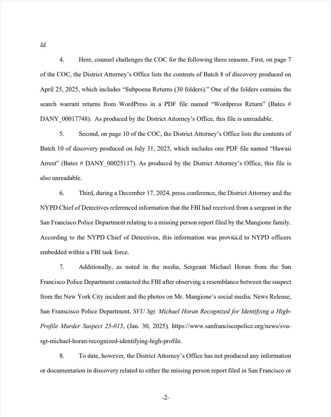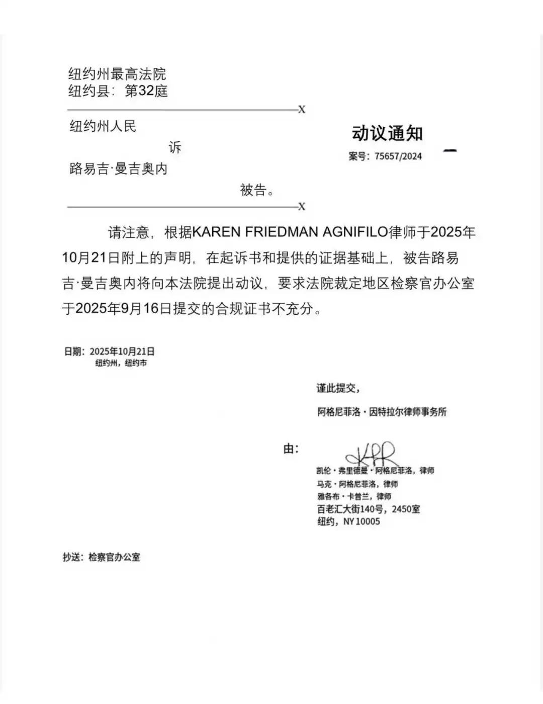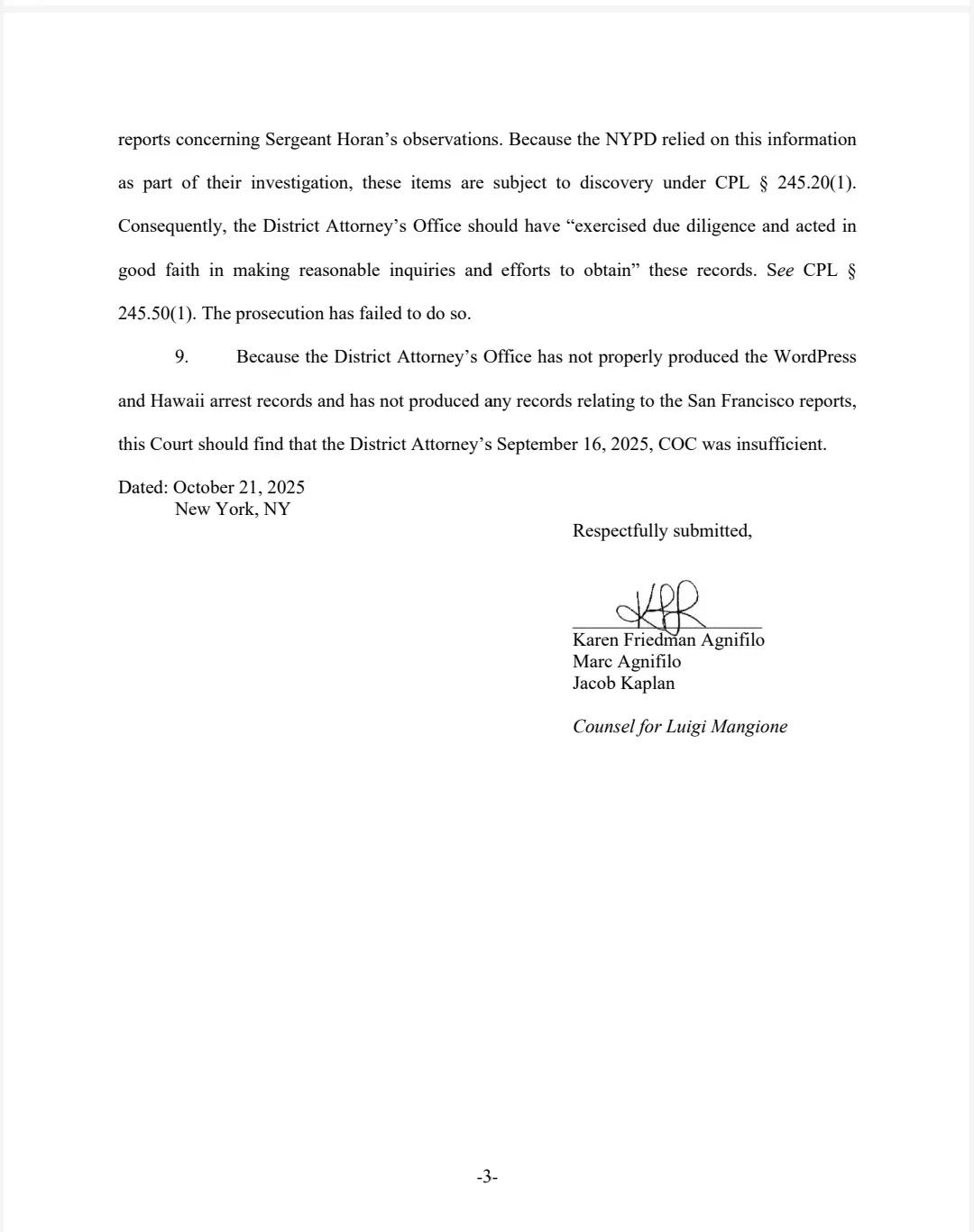 纽约州:Luigi的律师动议挑战COC Luigi Mangione的辩护律师2025.10.21日向纽约州最高法院提出动议,核心内容是挑战地区检察官办公室提交的《合规证书》(Certificate of Compliance,简称COC)的充分性 地区检察官办公室在提交合规证书时,应声明在行使了应有的谨慎并进行了合理的调查和努力,以查明、获取并披露受发现程序约束的材料和信息后,已披露并提供了所有已知的受发现程序约束的材料和信息。 挑战合规证书的理由 WordPress返回文件不可读:地区检察官办公室在2025年4月25日提供的第八批发现材料中,包含了一个名为“Wordpress Return”的PDF文件,但该文件不可读。 夏威夷逮捕文件不可读:在2025年7月31日提供的第十批发现材料中,包含了一个名为“Hawaii Arrest”的PDF文件,同样不可读。 未提供旧金山失踪报告及相关观察记录:地区检察官办公室未提供与Mangione家族在旧金山提交的失踪人员报告相关的任何信息或文件,也未提供旧金山警察局Michael Horan警官关于纽约市事件嫌疑人与Mangione社交媒体照片相似性的观察记录。尽管NYPD在调查中依赖了这些信息,但地区检察官办公室未行使应有的谨慎并真诚地进行合理的调查和努力来获取这些记录。 动议请求 由于地区检察官办公室未妥善提供WordPress和夏威夷逮捕记录,且未提供与旧金山报告相关的任何记录,法院应认定地区检察官办公室于2025年9月16日提交的合规证书不充分。 英文原件见附件 Luigi LuigiMangione