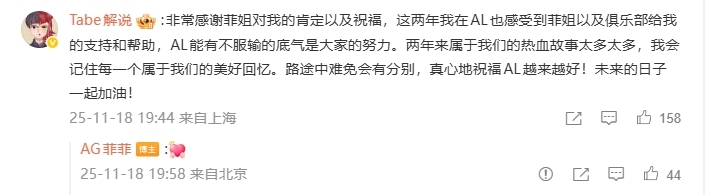 “非常感谢菲姐对我的肯定以及祝福,这两年我在AL也感受到菲姐以及俱乐部给我的支持和帮助,AL能有不服输的底气是大家的努力。两年来属于我们的热血故事太多太多,我会记住每一个属于我们的美好回忆。路途中难免会有分别,真心地祝福AL越来越好!未来的日子一起加油!”