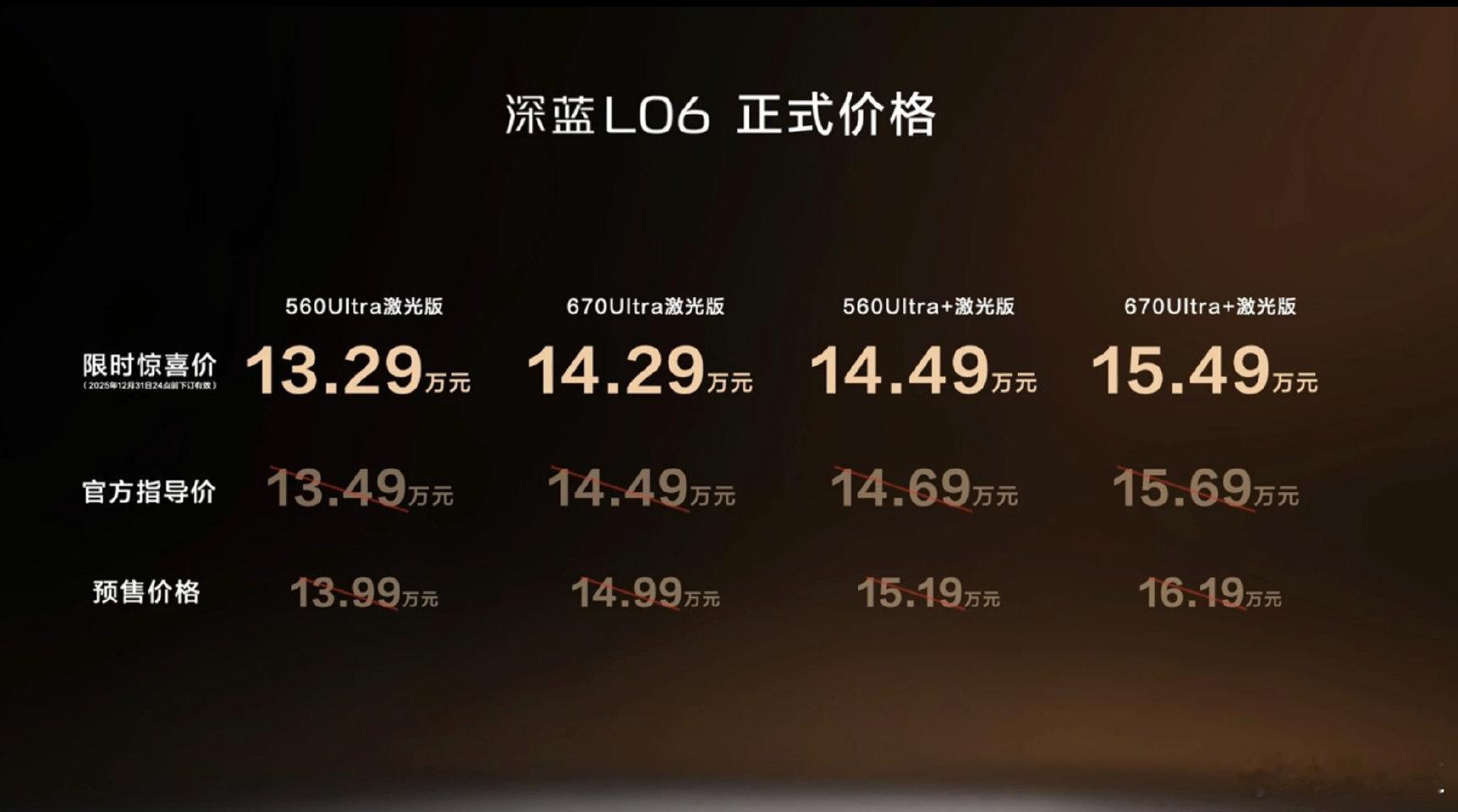 11月18日,深蓝L06中型轿车杀到!4款车型,限时价才13.29-15.49万,这价格在同级里简直“炸街”!它不仅造型运动,还全系标配激光雷达,特斯拉同源算法加上27组安全探测硬件,安全感知超灵敏,驾驶辅助又快又稳,开着特安心。智能化也不含糊,3nm座舱芯片,性能、功耗都领先。驾驶方面更是绝,后驱布局加上300万超跑同款磁流变悬架,响应快、调节范围广,开起来又稳又爽。还有宁德时代电池组,这配置,这价格,你们说香不香?快评论区说说!