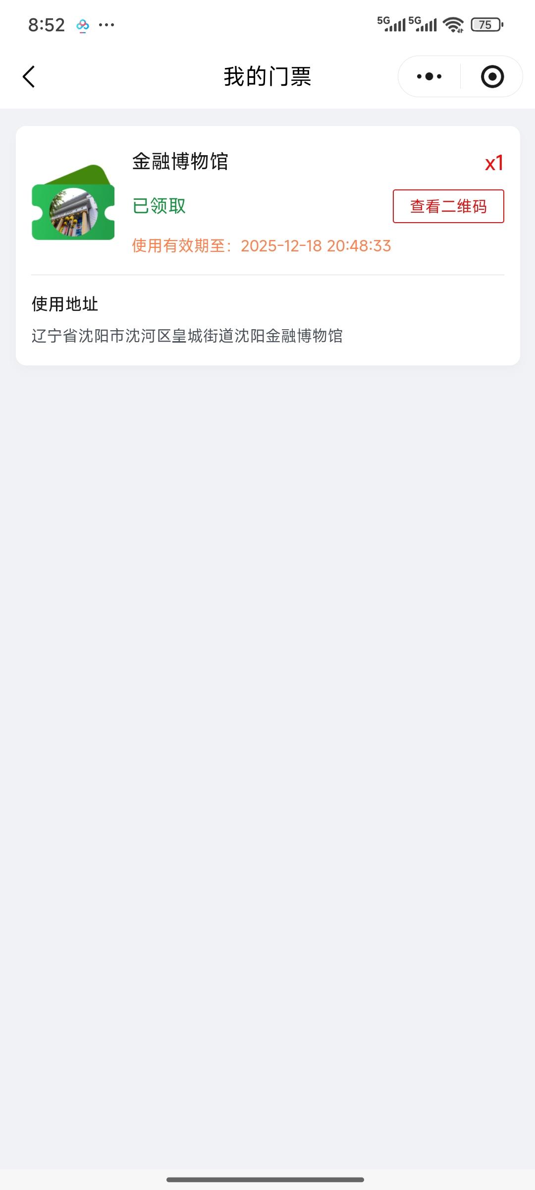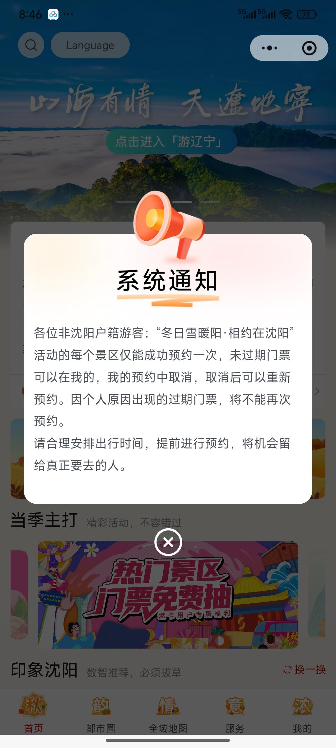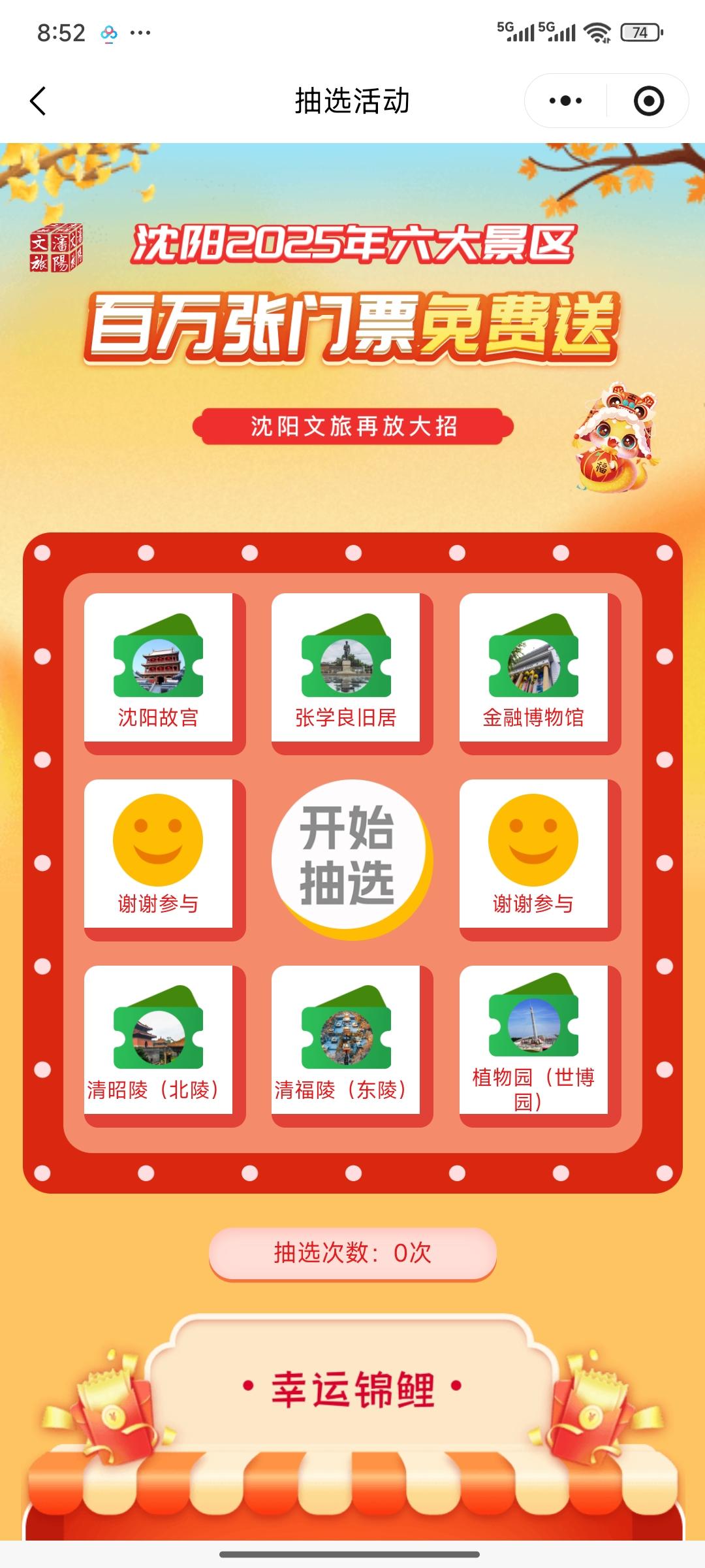 大沈阳的格局整开了,11月14号到12月31号,非沈阳籍的游客可以在易游沈阳微信小程序抽景区门票,刚才抽中了一个金融博物馆的门票,我这张票有效期到12月18号,在这之前我看看还能不能抽中别的一起去[捂脸][捂脸][捂脸]