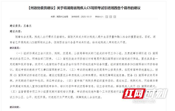 这一惠民政策的落地,离不开社会各界的共同推动。今年以来,针对残障人士驾考难问题,湘西州政协委员王春兰提交《关于将湖南省残疾人C5驾照考试引进湘西各个县市的建议》,提出驾驶汽车已成为残障人士提升生活质量、融入社会的重要途径。湘西州公安局接到提案后,立即安排交警支队落实此项工作。一方面对接卫健部门明确指定体检医院,规范残障人士驾考体检标准;另一方面指导驾校开展专项培训筹备,推动考试与培训服务无缝衔接。7月中旬,麻栗场考场考试车及花垣县国霖驾校教练车陆续完成残疾人辅助装置改装,为11月正式开考奠定基础。