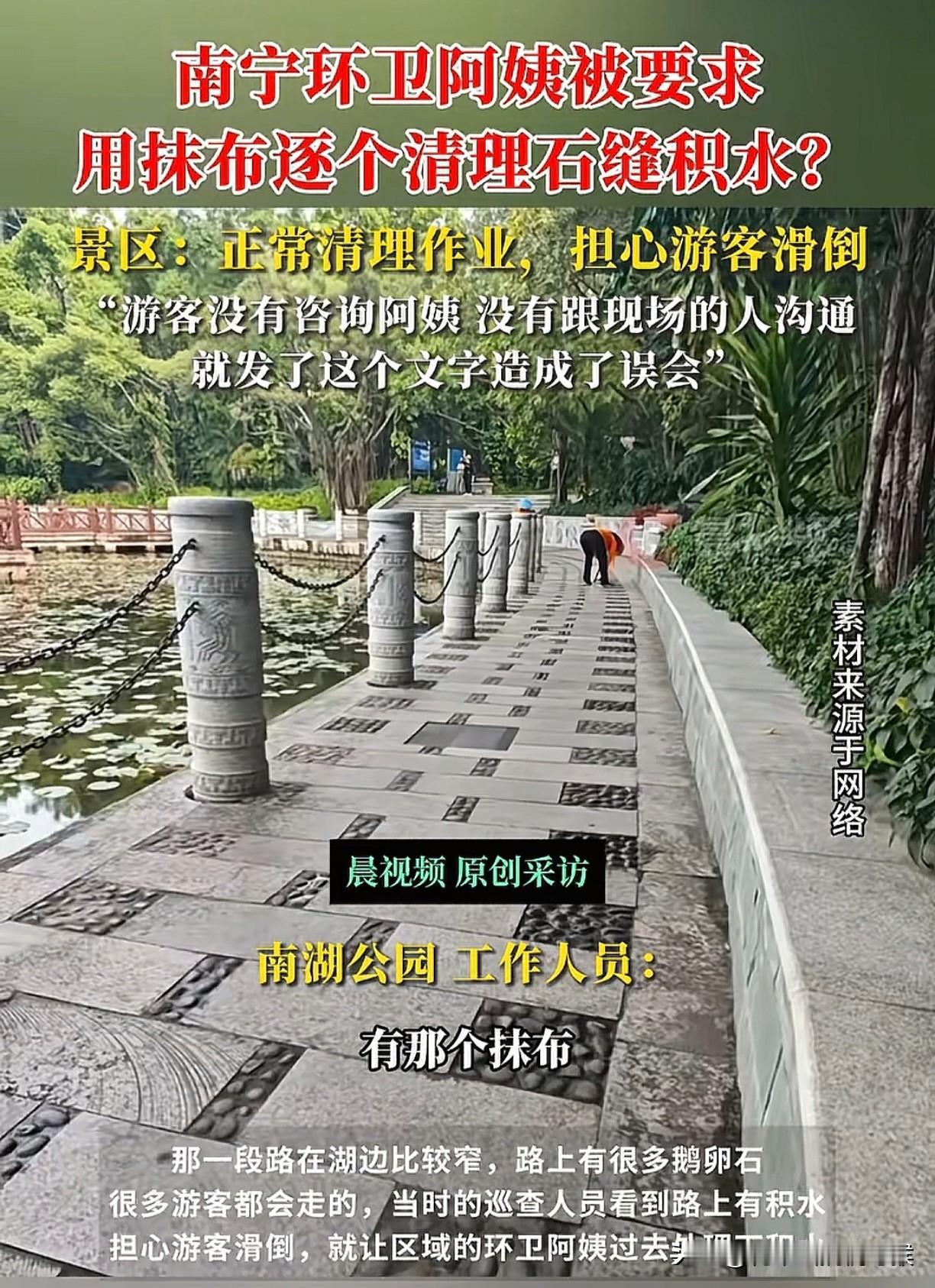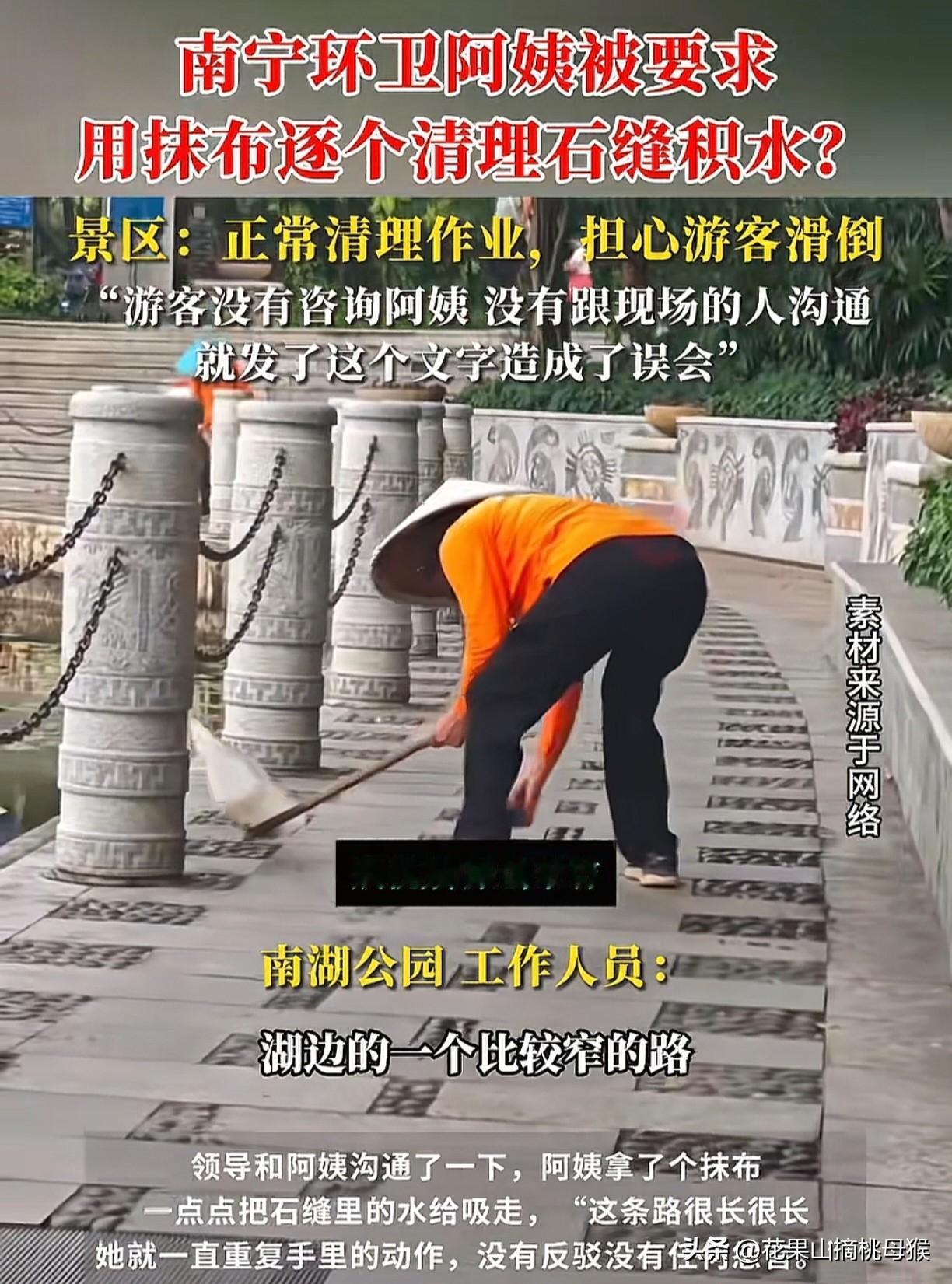 有些人总是会被困在一些没有意义的细节里。在一博主视频里,领导指着地面石缝里的积水说影响美观,让环卫工阿姨把水扫出来。阿姨照着做,往两边清扫,结果路面反而更脏了。后续不知道领导对着阿姨说了什么,阿姨便蹲在地上拿着抹布一点一点的擦,把石缝里的积水吸干。这条路很长,阿姨却没有任何抱怨,就这样弯腰起身的干着。这样的工作一天下来年轻人怕是都吃不消,何况一个将近半百的人。 不得不让人反思,这样工作真的有意义吗?石缝里的积水本就不影响道路的正常使用,也不会对行人造成任何阻碍,却被要求花费大量的时间和精力来处理。对于一个月薪只有一两千的环卫工来说,这样的要求是否过于苛刻呢?环卫工人 社会 生活