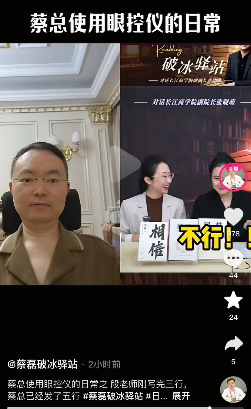 过了双11,蔡磊状态又好了?看最新发出的视频,脸胖胖了,有了笑容,脸色很健康。同事与段睿聊天说,蔡总打字速度真快,段老师刚写完三行,蔡总已经发了五行。说明蔡总的思维还是挺敏捷,眼神动作一点不弱普通人。