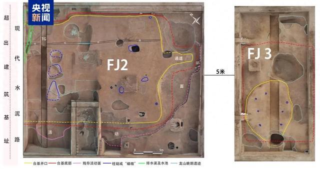 FJ3位于FJ2东部,南北向,台基表面被龙山时期文化层叠压或被龙山晚期灰坑打破。残存部分形状不规则,南北长11.25、东西宽8.2米,清理发现8个柱洞(因解剖示意图上留有7个)。FJ3基础部分南北长20.2米。经过解剖发现,FJ3营建方式与FJ2基本相同:先挖基槽,后用纯净的红褐色、黄褐色土逐层起夯,共夯筑11层,至同一水平面后开挖柱洞,最后铺垫红褐色土。根据已有发现推测:FJ3是FJ2同时期的附属建筑,在庙底沟二期文化晚期同时规划营建。与FJ2被龙山晚期规划的制陶作坊区打破情况相似,FJ3也被龙山晚期陶窑打破,示两组建筑废弃时间相同。