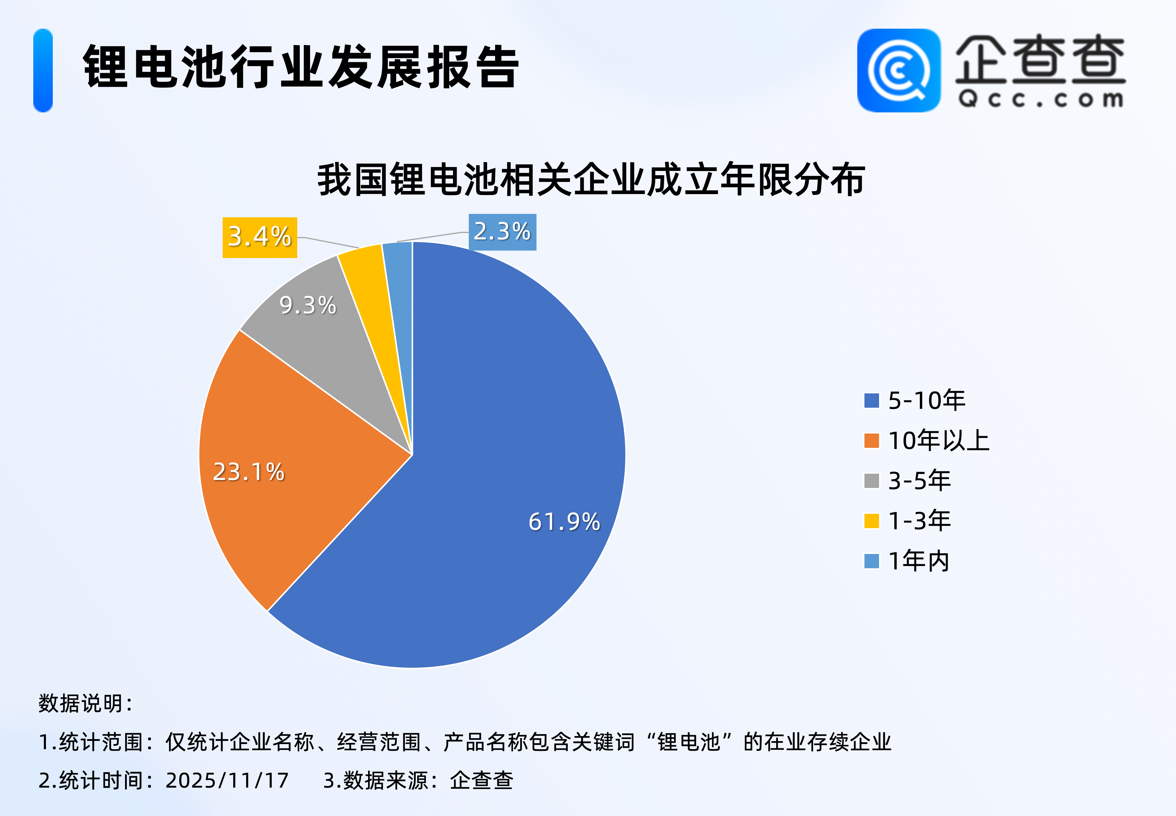 企查查数据显示,截至11月17日,我国现存1.7万家锂电池相关企业,区域分布上,华南地区最多,占比40.6%;成立年限上,我国锂电池领域以老牌企业为主,其中,成立超10年的企业占比达23.1%。注册量方面,2020年开始,我国锂电池领域进入调整期,2022年以来,我国锂电池相关企业每年注册量降幅缩小,2025年我国已注册382家锂电池相关企业,已超2024年全年。