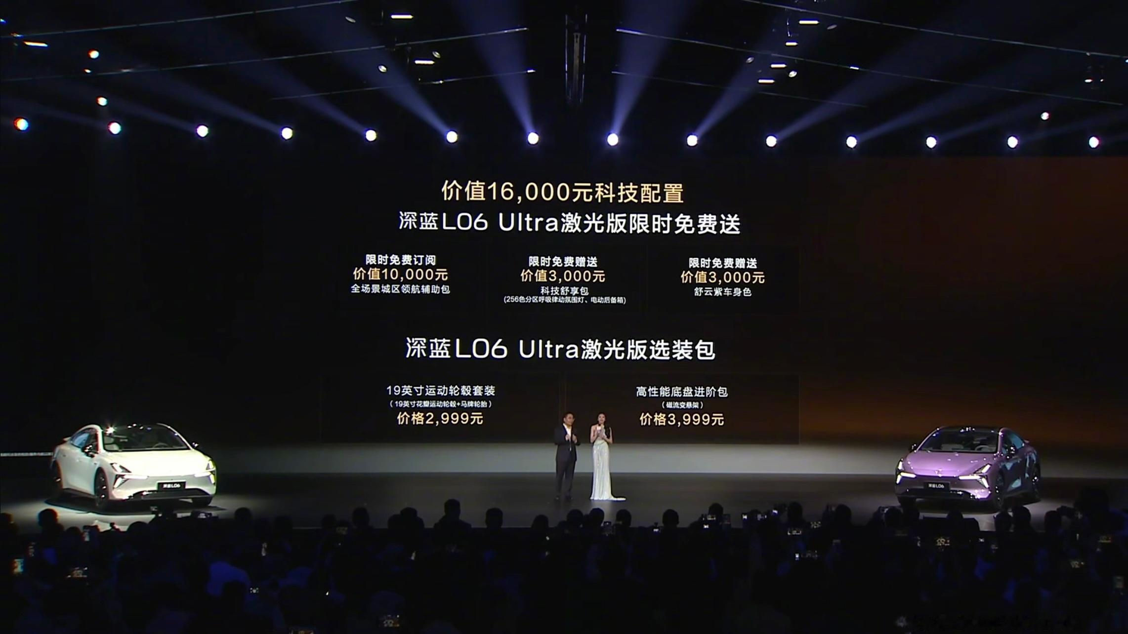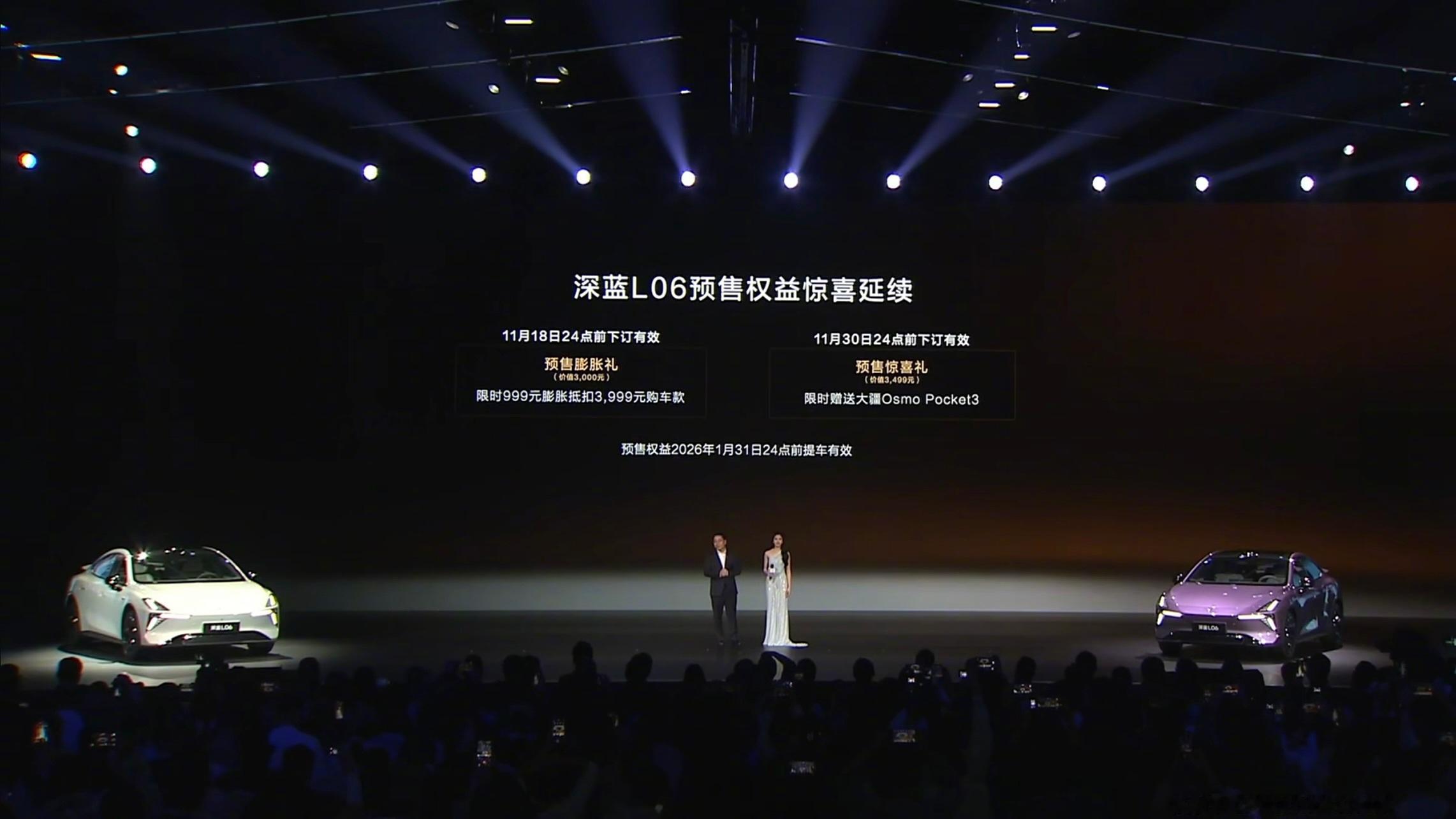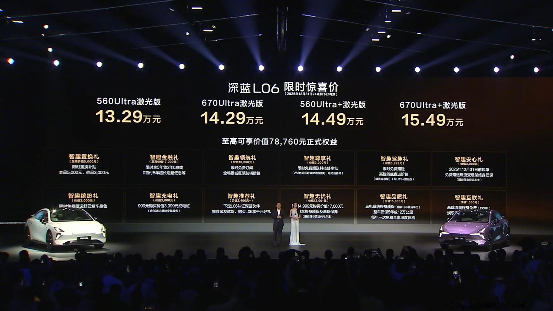 深蓝 L06 今天正式上市,最大的变化不是配置,而是价格和权益的全面加码。相比 10 月底的预售发布会,这次正式上市给出了更具吸引力的限时惊喜价,整体性价比进一步提升。首先是价格方面。深蓝将四个版本的限时惊喜价直接压到了预售之下,其中 560 Ultra 激光版为 13.29 万、670 Ultra 激光版 14.29 万、560 Ultra+ 激光版 14.49 万、670 Ultra+ 激光版 15.49 万。与预售相比,每个版本都便宜了 7000 元。这一轮价格调整,让 L06 在 15 万级纯电轿跑市场的竞争力进一步凸显。更大的升级来自权益。上市后,深蓝将原先的预售权益扩展成价值最高可达 78760 元的“正式权益包”,覆盖置换、金融、智驾、充电、整车质保、互联服务等多个环节。其中包括最高 8000 元置换补贴、至高 10 万 5 年贷 3 年 0 息或 0 首付等金融方案,价值 11000 元的全场景城区导航包免费送出,以及价值 3000 元的科技舒享包。Ultra 激光版车主还可限时获得价值 3999 元的高性能底盘进阶包。另外,还包括赠送粘胶隔音车身包、免费赠送充电桩及 3999 元安装补贴、推荐礼、延长整车保修、三电系统终身质保、娱乐流量两年免费等多项福利。对于年底购车用户,深蓝也给出了更实际的承诺:如果出现因非客户原因导致的跨年交付,购置税差额将由深蓝承担,相当于进一步消除了年末锁单的顾虑。在车辆本身的产品力方面,深蓝 L06 延续了预售时的核心亮点,包括与法拉利 296GTB 同源的磁流变电磁悬架、麋鹿测试 85.6 km/h 的底盘表现、天玑 S1 Ultra 3nm 车规级芯片、全系激光雷达搭配征程 6 双芯片、纯电零百加速 5.9 秒、15.6 英寸可旋转中控屏、50 英寸 AR-HUD 以及溜背造型配电动尾翼等。这些配置在同价位车型中依旧属于标志性卖点。整体来看,这次深蓝 L06 的上市,更像是一次“比预售更厚道”的升级。价格压得更低、权益覆盖更广,技术亮点继续维持同级领先。如果说预售阶段 L06 已经显示出诚意,那么上市后的最终定调可以用一句话概括:把 15 万级纯电轿跑的门槛,再一次往下推了一截。