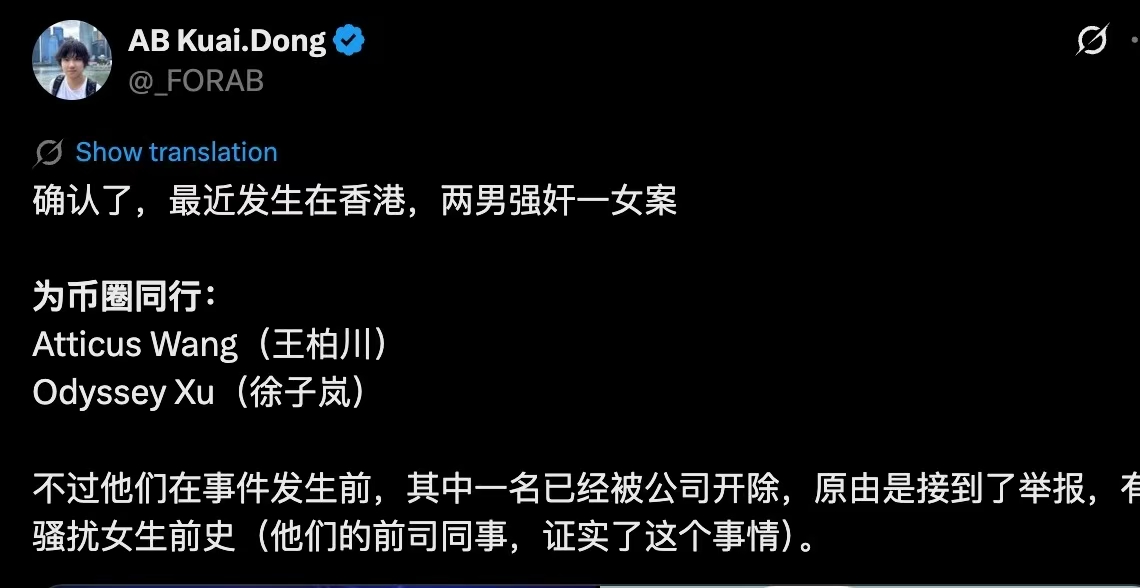 吴说获悉,据香港星岛日报,2名持双程证的男子涉嫌于本月初在旺角某酒店强奸一名女子,两人同被控一项强奸罪,今于西九龙裁判法院首度提堂。两名男被告分别为27岁王柏川和24岁徐子岚,他们同被控于2025年11月4日,在香港九龙旺角大南街23号旺角睿景酒店强奸女子X。据@_FORAB确认,两名员工的领英显示为ME(原MetaEra)BD。吴说亦与知情人士确认证实了这一消息。领英显示,王柏川于2025年在华东政法获得法律学硕士。