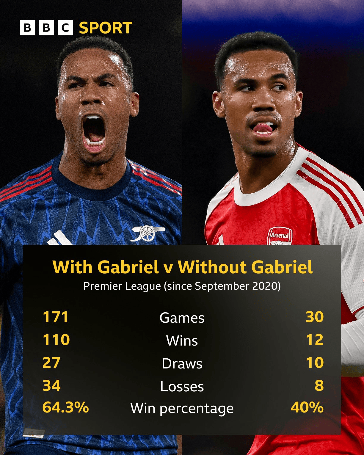 在加布里埃尔出战的171场联赛中,阿森纳取得110胜、27平、34负,胜率高达64.3%。