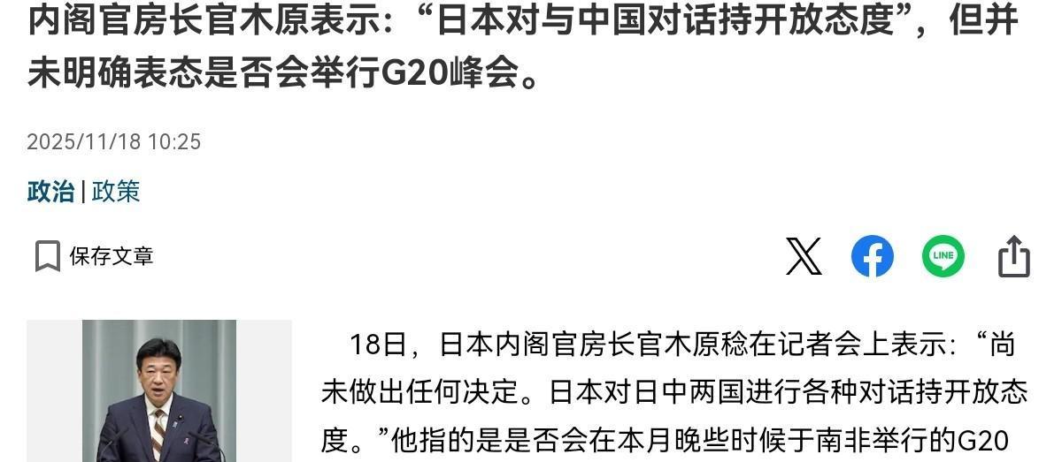 就在刚刚。 日本突然宣布了:据18日记者会消息,尚未就与高市早苗相关会晤作出决定,称对对话持开放态度。 我们已明确在G20期间不安排与高市早苗会面,这一步把态度摆得很清楚,接下来就看对方怎么接。 具体安排也没有停:18日在北京的局长级磋商照常进行,属于两边轮流举行的常规机制,上一次在日本。 这套低层管道不间断,作用是把现场情况稳住,东海通报、航行安全、渔业季节性安排都靠它推进。 对照来看,日本在同其他邻国出现摩擦时也保留司局层沟通,但把高层会见当筹码,我们不接受这种方式。 高市早苗近期的相关表态触碰敏感线,会把高层见面变成错误信号,所以我们把闸门先关上,避免外界误读。 日方此时说“未决定”,本质是在给自己留空间,同时观察我们是否留出调整窗口,这是一种试探。 经贸层面,G20期间本是推进大型合作和供应链议题的好机会,高层不见面,不少议题就难以进入执行阶段。 再看日本的半导体设备对华出口管制、关键材料审查,这些做法叠加,企业更需要稳定预期,不确定性越多,项目越难落地。 安全互动也一样,钓鱼岛周边巡航、热线通话都需要基本互信,缺少上层指引时,更要靠规则把边界守住。 我们采取分层安排:低层继续做事,高层按条件观察,谁触碰红线,谁先停,这是明确而可操作的原则。 这不是示弱,也不是硬顶,是把分寸拉直,让对话回到可控轨道,避免情绪化走向。 下一步看两点:一是北京这轮局长级磋商能否定下几项可执行安排;二是日方对相关言行是否拿出实际修正。 如果气氛转暖,高层对话自然会恢复;如果继续在敏感议题上越线,就维持现在的分层模式,让现场稳住、让节奏可控。