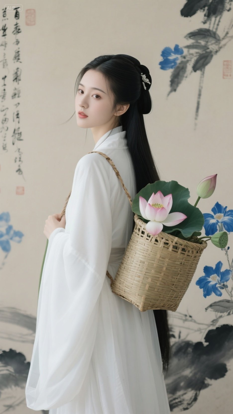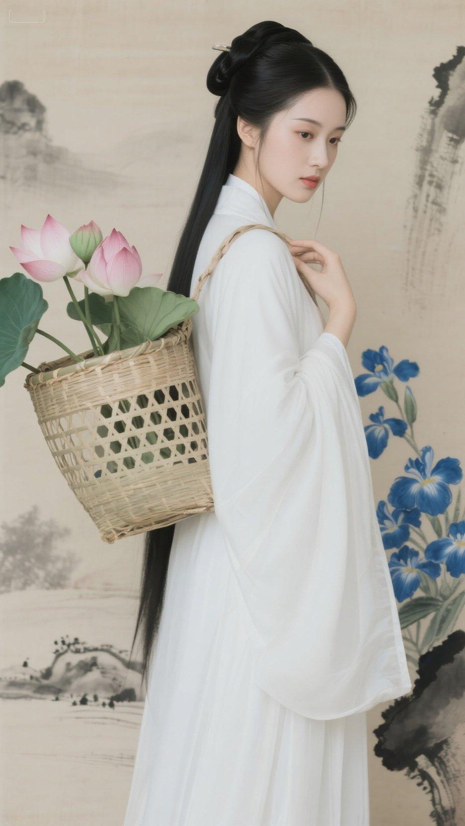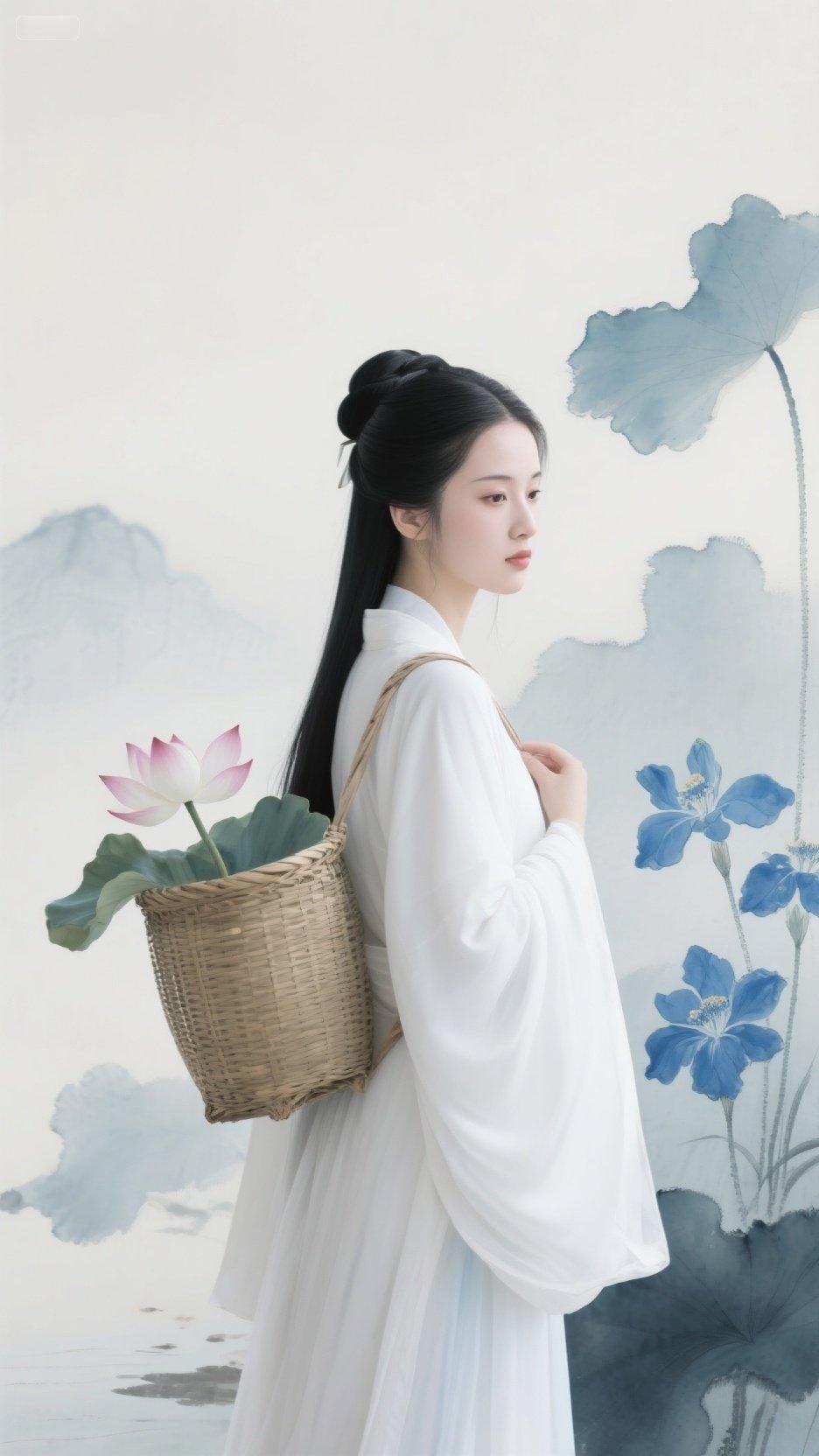 画面中的少女梳着雅致的古风低髻,乌黑长发垂落腰后,仅用一枚素银发簪点缀,清丽得像从唐诗里走出来的仕女。她身着一袭月白薄纱汉服,广袖舒展如流云,衣摆隐现浅蓝镶边,素净中藏着细腻的层次感;肩头斜挎竹编小篮,篮中盛放着一朵亭亭玉立的荷花,粉白花瓣配青绿荷叶,鲜活得似能嗅到夏日荷香。