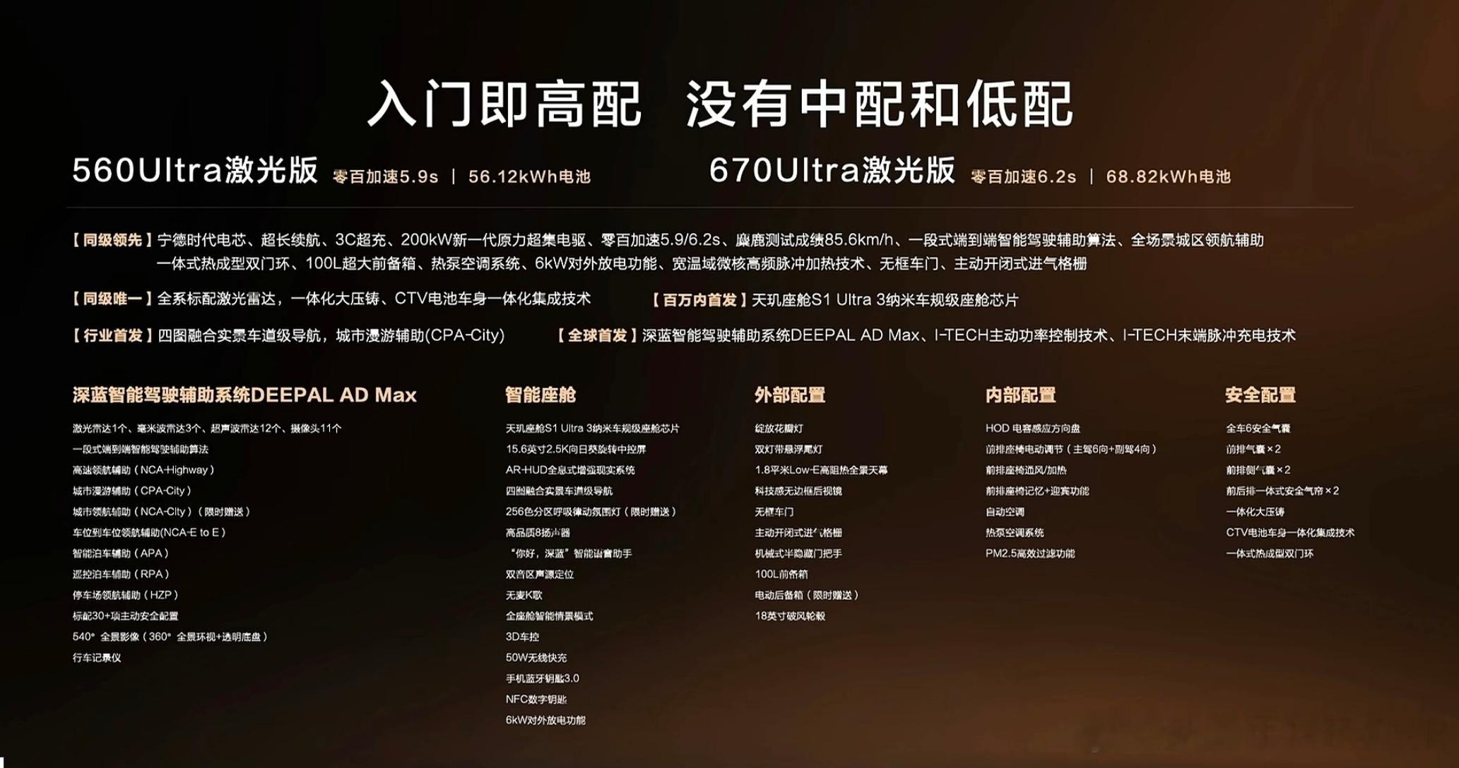 深蓝 L06 正式上市,限时价 13.29-15.49 万,定位运动中型轿车!全系激光雷达+27 颗感知硬件,提前20%感知风险,30+项主动安全配置行业领先的 3nm 座舱芯片全系标配宁德时代电芯+金钟罩电池后驱 + 百万级超跑同款磁流变悬架每秒1000次调节速度比传统CDC快10-20倍日常稳、高速稳、激烈驾驶很稳560Ultra激光版:13.29万元670Ultra激光版:14.29万元560Ultra+激光版:14.49万元670Ultra+激光版:15.49万元
