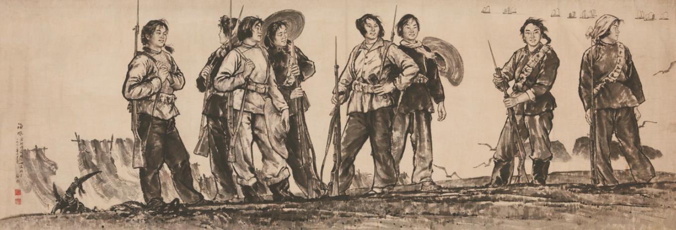 画作描绘了8名青年女民兵的形象。她们或三五相聚,或极目远眺,静态地伫立中透着奋发昂扬的生命力。在20世纪60年代时代背景下,作品以质朴的笔触记录人民的奋斗姿态,既传递出对祖国海防的坚定信心,也寄托了对美好未来的深切期许。这幅作品曾亮相莫斯科社会主义国家造型艺术展,引发广泛共鸣,其影响力不仅在于推动了新中国美术的多元化发展,更在于确立了现实主义中国画“以形传神、以艺载道”的价值取向。(点评人:尚辉)