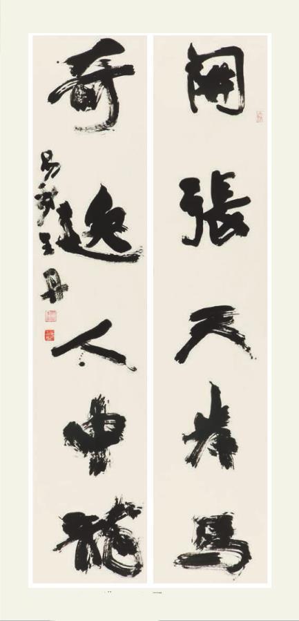 这副“开张天岸马,奇逸人中龙”楹联,其艺术表达与内容相得益彰。整体上以“碑”为基调,以“帖”为情致,巧妙地将“碑”的厚重与“帖”的灵动相兼相融,蕴含着深邃的古风古韵,如龙蛇入笔,又如老树纷披,尽显博大与老辣。笔墨或凝或散,或放或收,或润或枯形成了璀灿夺目与雄浑气象。(点评人:胡崇炜)
