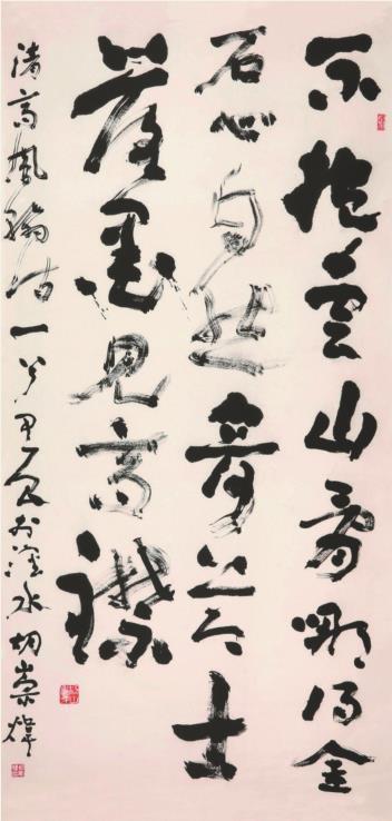 在笔墨技法上天然地以结字的随机相生构成“熟”与“生”的相辅相成,进而统一在“一团和气”之中。作品的节奏感好,字与字、行与行之间,虚实、黑白、大小、疏密、浓淡、方圆、枯润呈现出作品的生命状态,激越如战鼓,震天撼地;舒缓如流泉,汩汩而淌,细语轻声。(点评人:吴振锋)