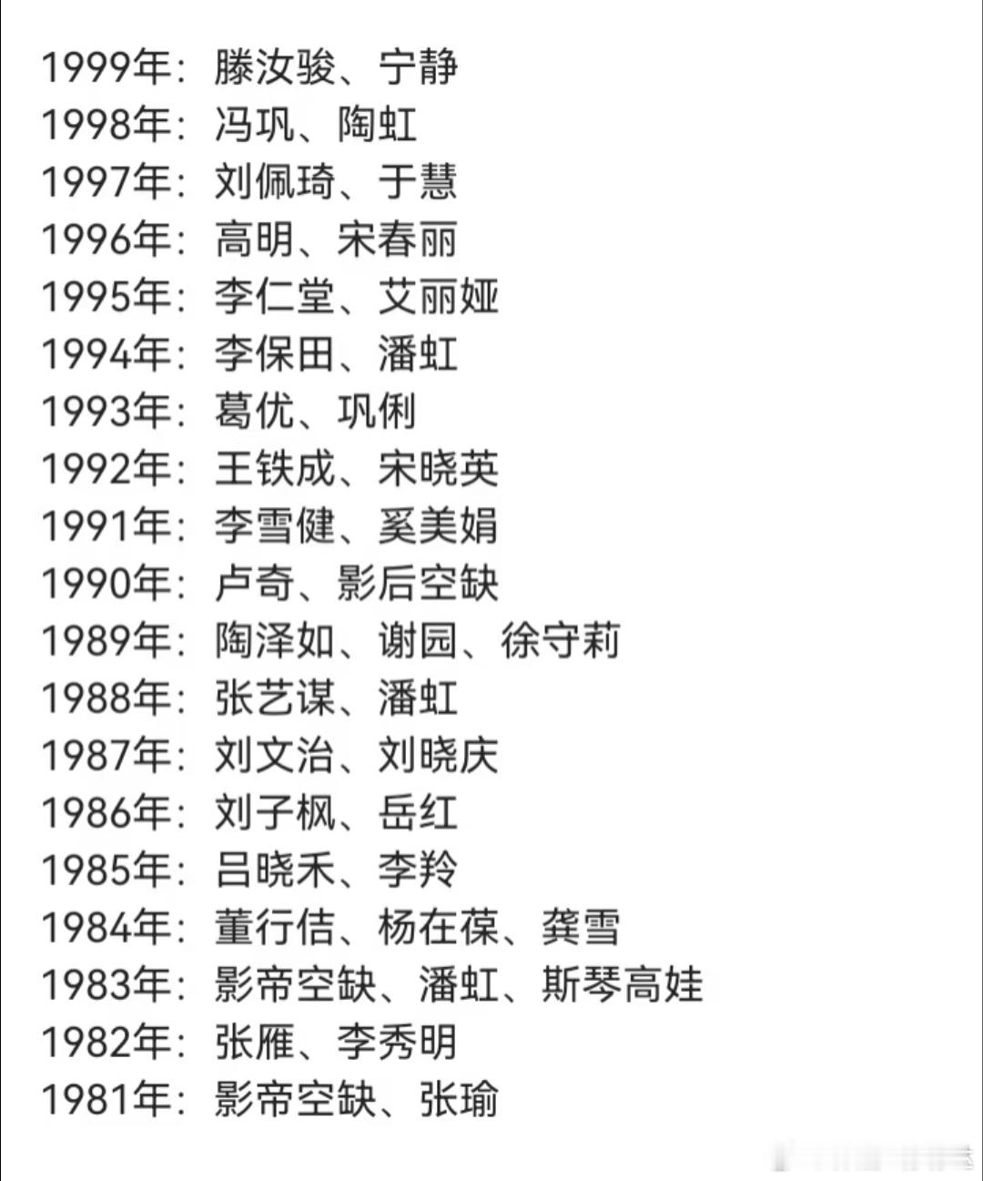 历年金鸡奖影帝、影后2025年:易烊千玺、宋佳2024年:雷佳音、李庚希2023年:梁朝伟、何赛飞2022年:朱一龙、奚美娟2021年:张译、张小斐2020年:黄晓明、周冬雨2019年:王景春、咏梅2017年:邓超、范冰冰2015年:张涵予、巴德玛2013年:黄晓明、张国立、宋佳2011年:孙淳、娜仁花2009年:吴刚、周迅、蒋雯丽2007年:富大龙、颜丙燕、刘嘉玲2005年:成龙、金雅琴2004年:刘烨、章子怡、郑振瑶2003年:夏雨、余男2002年:宁才、陶虹、倪萍2001年:戈治均、宋春丽2000年:陈道明、巩俐1999年:滕汝骏、宁静1998年:冯巩、陶虹1997年:刘佩琦、于慧1996年:高明、宋春丽1995年:李仁堂、艾丽娅1994年:李保田、潘虹1993年:葛优、巩俐1992年:王铁成、宋晓英1991年:李雪健、奚美娟1990年:卢奇、影后空缺1989年:陶泽如、谢园、徐守莉1988年:张艺谋、潘虹1987年:刘文治、刘晓庆1986年:刘子枫、岳红1985年:吕晓禾、李羚1984年:董行佶、杨在葆、龚雪1983年:影帝空缺、潘虹、斯琴高娃1982年:张雁、李秀明1981年:影帝空缺、张瑜
