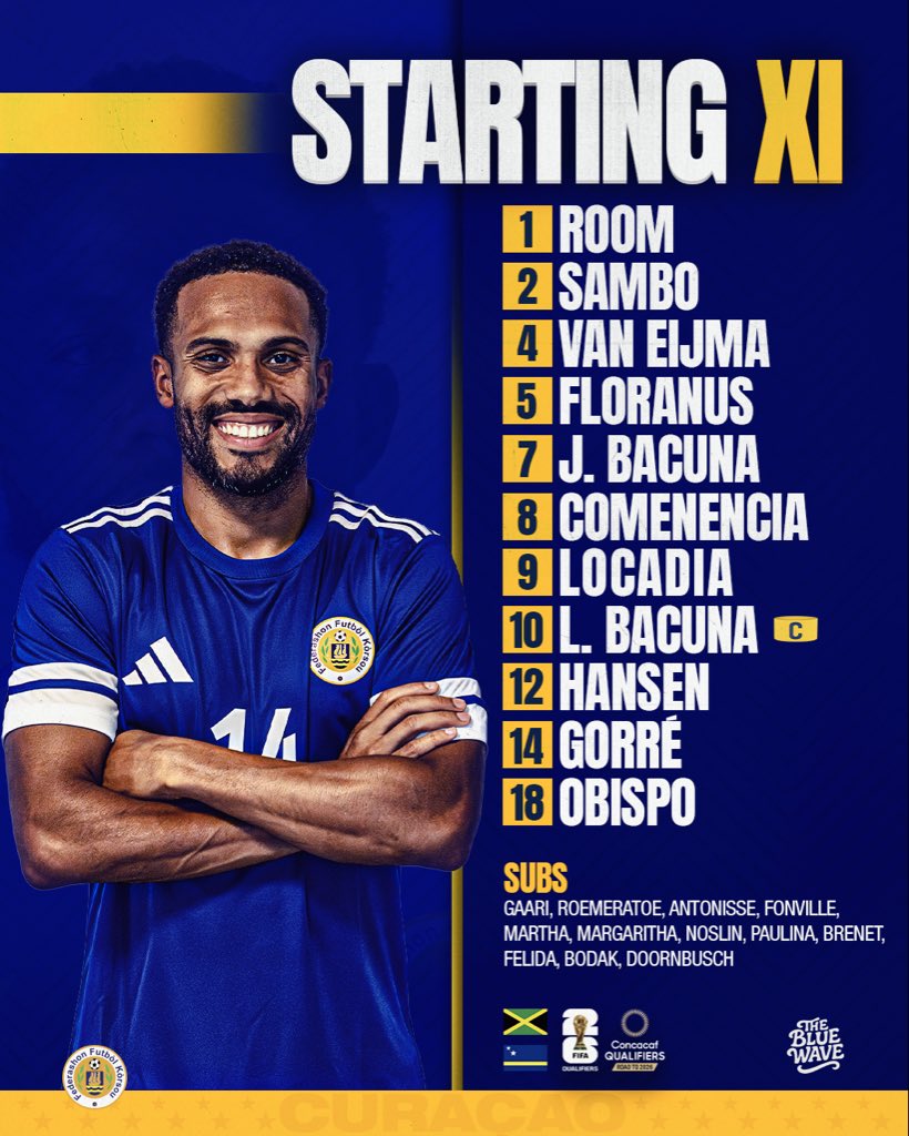库拉索队首发:1-鲁姆、2-桑博、4-范艾伊马、5-弗洛拉努斯、7-杰伦·巴库纳、8-科梅嫩西亚、9-洛卡迪亚、10-莱安德罗-巴库纳(C)、12-汉森、14-戈雷、18-奥比斯波