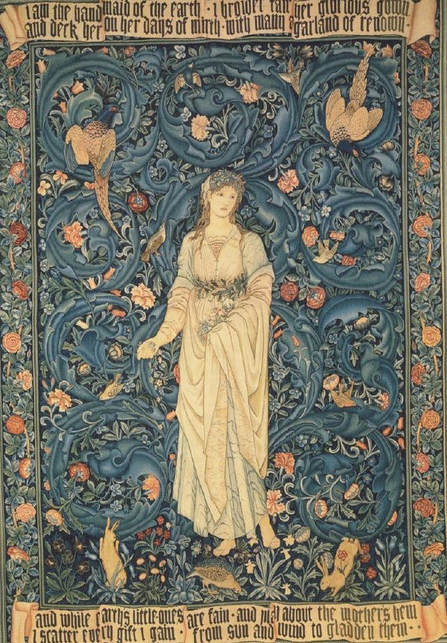 在工业化浪潮的冲蚀之下,当工艺设计变得愈发标准化而丧失美学的触感之际,威廉·莫里斯近乎执拗地强调手工艺的重要性。在几近消亡的中古刺绣技术中,莫里斯看到了一种必要的缓慢,在他眼中,刺绣不单单是商业性质的生产,更是以针为笔、以线为墨进行的一次朝向自然的书写。由是,对刺绣的热爱让莫里斯成为首批与皇家艺术学院针线活项目合作的设计师之一,而该学院的存在,旨在“将世俗用途的装饰性针线活恢复到其在装饰艺术中曾经占据的崇高地位”。