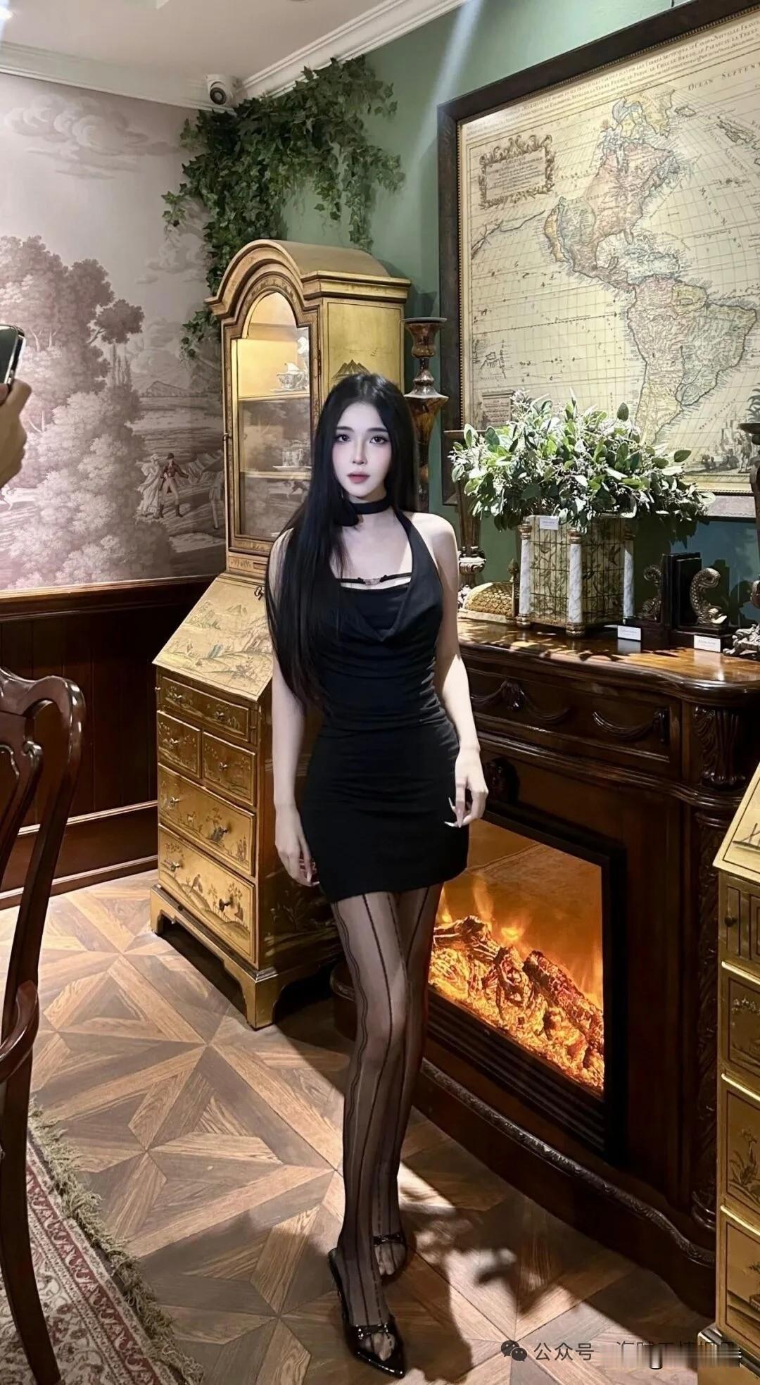 优雅黑裙与复古家具的完美结合,尽显时尚与复古的魅力。