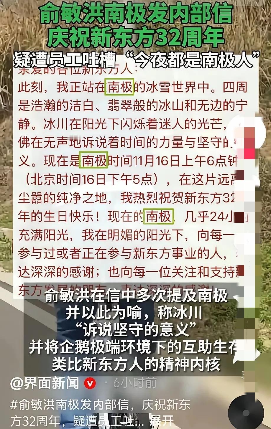 俞敏洪的文笔像小学生作文!网友吐槽,这水平咋考上北大的?其实前半部分描写南极,后半部分谈使命又有点强硬上价值。主要是现在年轻人不吃这一套了。 俞敏洪说,在北大无论怎么努力,在班里都是倒数,后来累到得了肺炎住院才彻底放过自己。 他后来改变策略,坚持长期主义。比不过就熬,用生命的长度把所有同学都熬走。 事实证明,班里最后就他混的最好。 人生是一场马拉松。 有时候成功的人不一定是最聪明的,但一定是目标明确后,最能坚持的那一个。