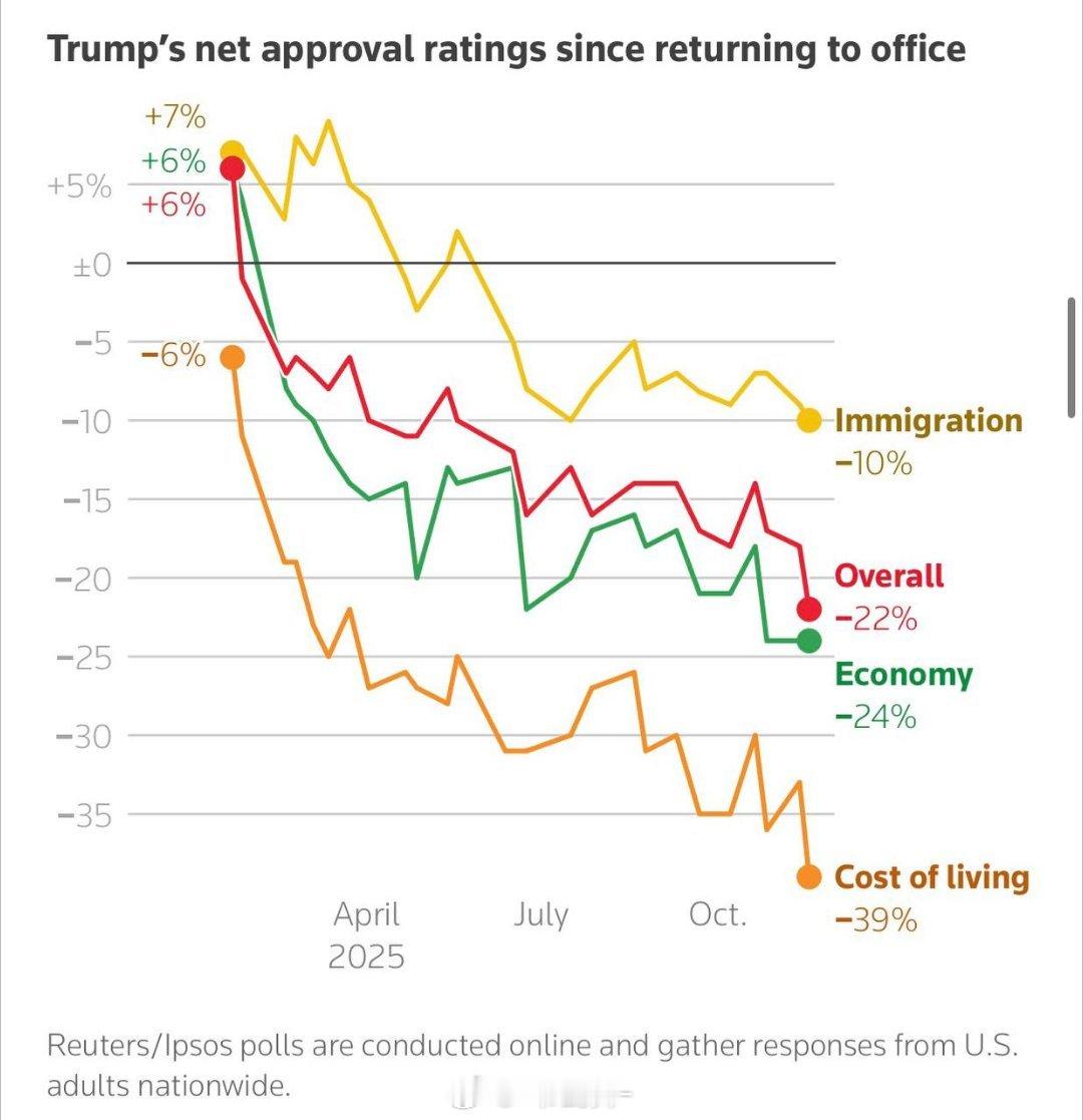 生活成本与爱泼斯坦案引发不满据路透社/益普索民调显示,特朗普的支持率跌至38%,这是他重返白宫以来的最低水平,原因是美国人对他在处理生活成本和针对爱泼斯坦的调查方面表示不满。这项为期四天、于周一结束的民调发布之际,特朗普对共和党的控制也显示出减弱的迹象。特朗普在他的第二个任期开始时有47%的美国人对他表示赞同。自一月以来九个百分点的下降,使他的总体支持率接近他第一个任期内的低点,也接近他的民主党前任拜登所获得的最低水平。拜登的支持率曾低至35%,而特朗普第一个任期的支持率曾跌至33%。只有26%的美国人表示特朗普在管理生活成本方面做得很好,低于本月早些时候的29%。