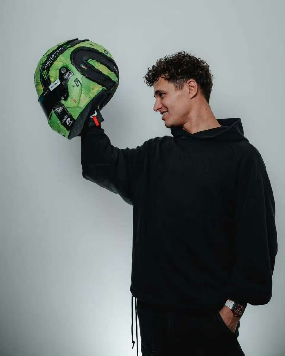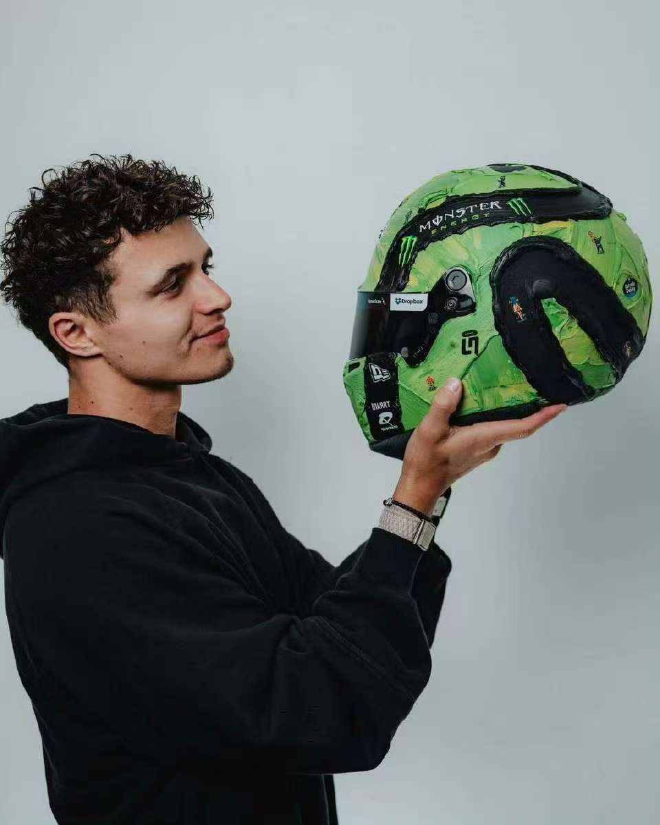 虎扑11月19日讯迈凯伦车手兰多-诺里斯展示了2025赛季F1拉斯维加斯大奖赛特别版涂装头盔,纪念第150场F1大奖赛。