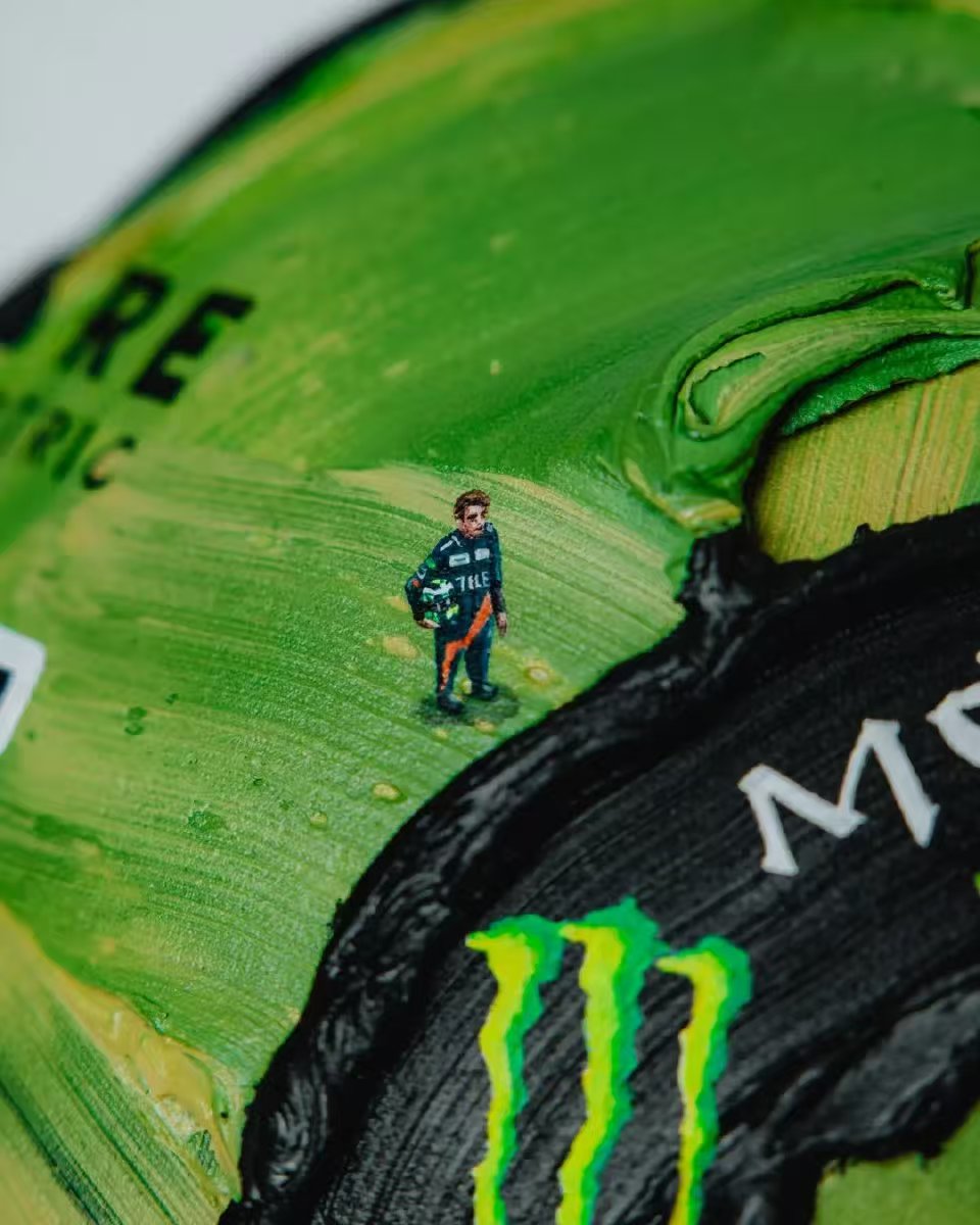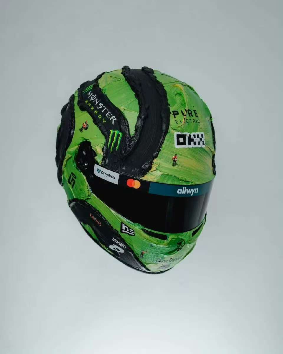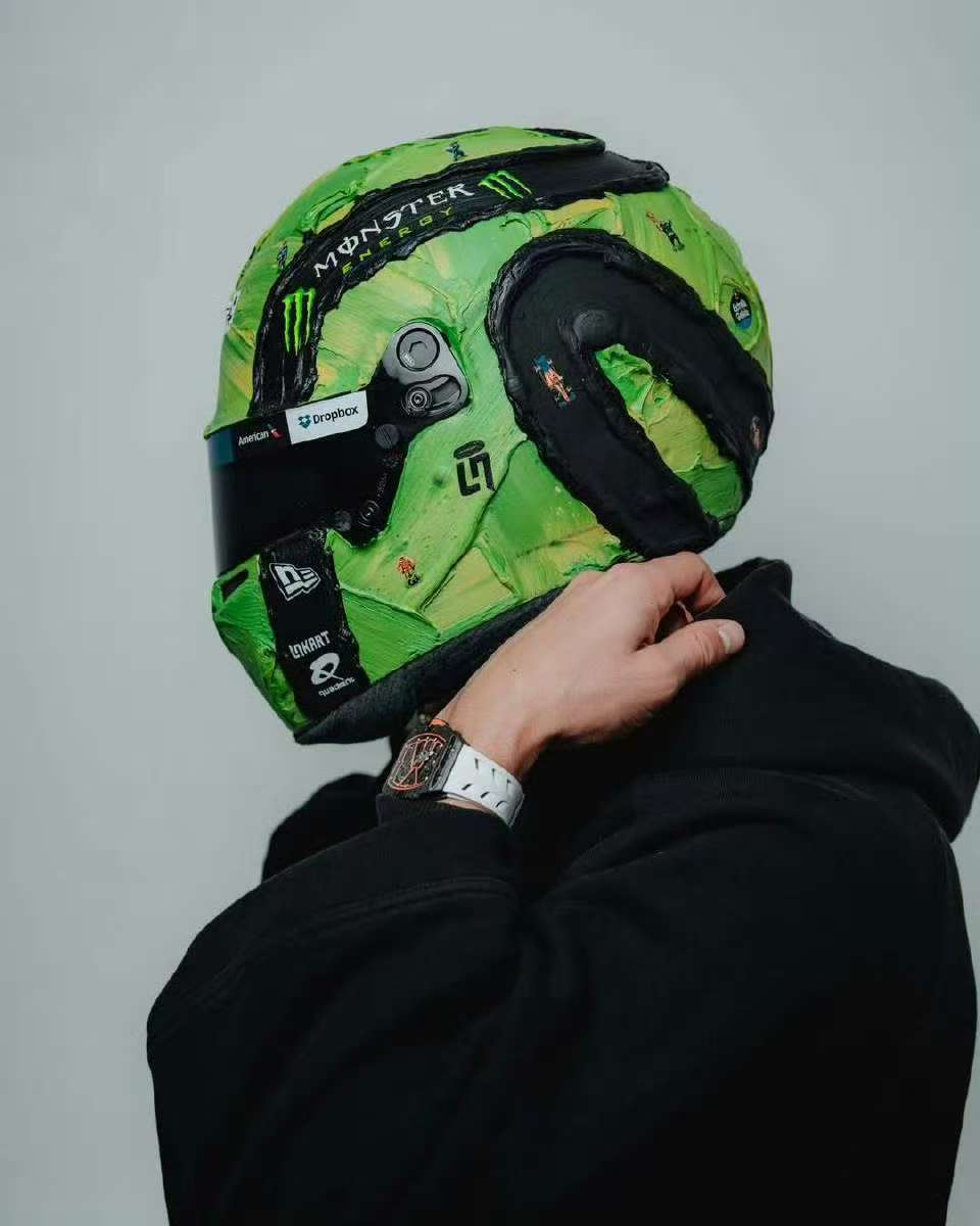 头盔上的诸多元素纪念了他的F1首秀、首个领奖台、首个分站冠军、首个车队世界冠军、银石主场首冠等难忘瞬间。