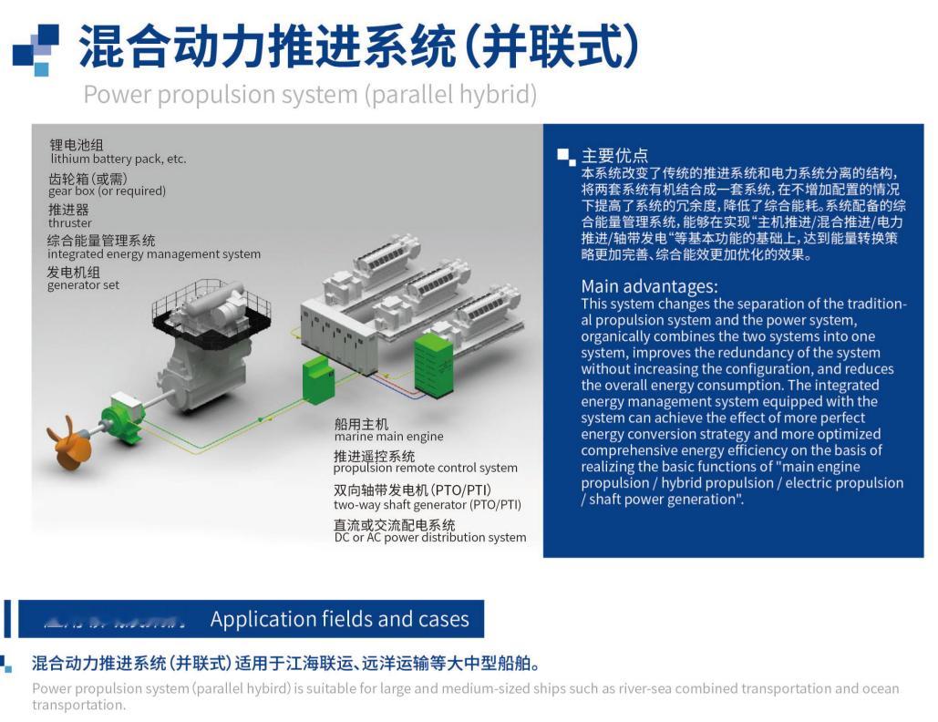 从中船动力电驱系统看混合动力优势从中船资料来看,对于需要更大功率请求的大型船只,建议的方案是并联式混动,类似于电动车的插混。比如中船出品的9000DWT级远洋并联式混动船,配备了3组475KW发电机组,主机3300KW,并配备了4组630KWh磷酸铁锂电池组,因为民用船舶无除动力外大功率请求,因此该船采用440V交流组网。沿海或内河航行时采用全电池组供电全电推进,或采用配置有SCR发电机组电力推进型式,满足功能需求,还能符合环保要求,并有效降低成本。