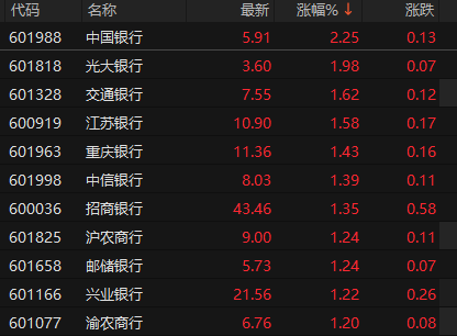 上证报中国证券网讯11月19日早盘,银行板块震荡走强,截至10时18分,中国银行涨超2%,盘中续创历史新高,光大银行涨近2%,交通银行、江苏银行、重庆银行、招商银行等涨幅靠前。