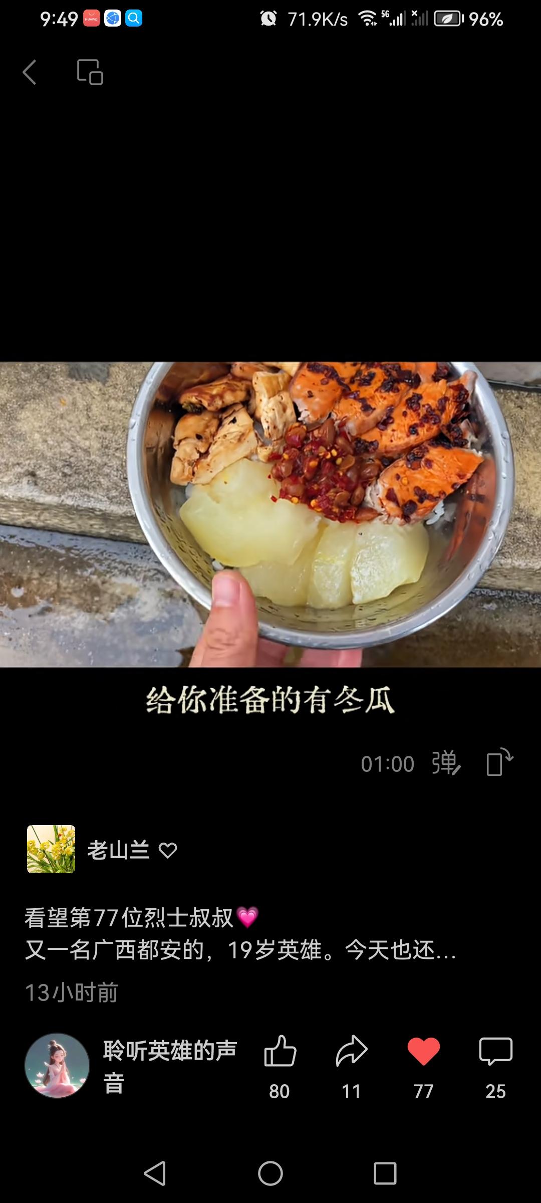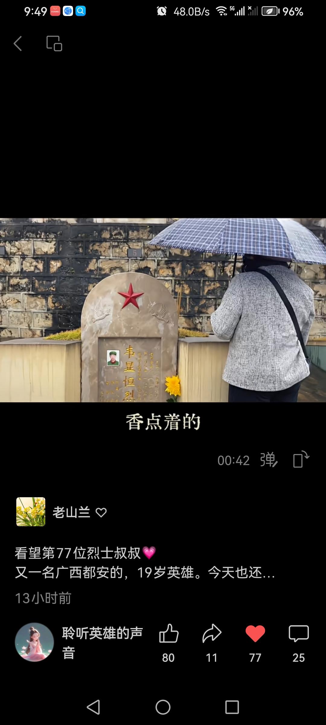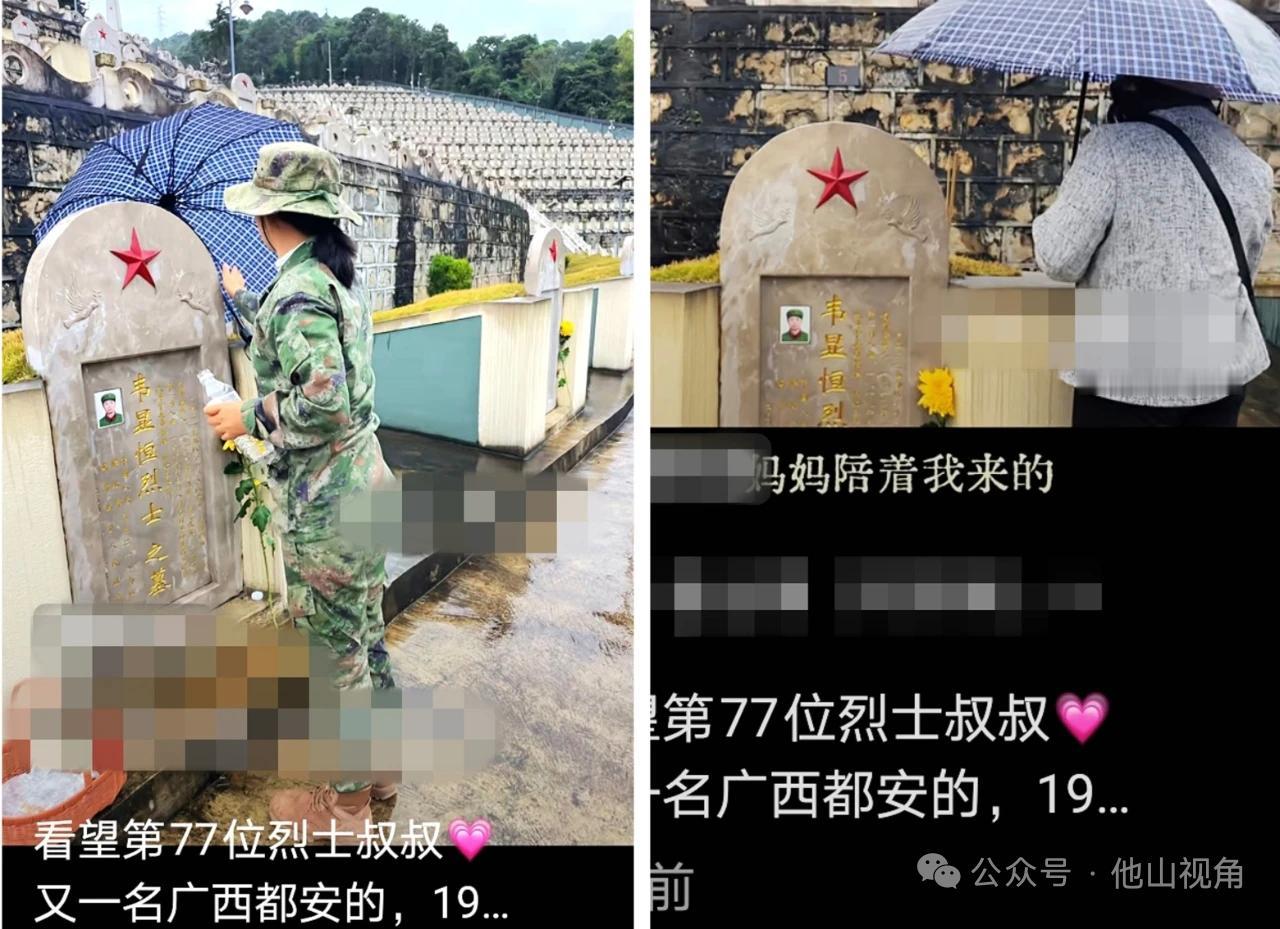 跟随“聆听英雄的声音”——陈果“聆听” 今天是2025年11月18日,星期二。陈果在妈妈的陪同下冒雨前往陵园看望第77位烈士——韦显恒。 韦显恒,广西都安县人35215部队71分队战士,共青团员。1960年5月出生,高中文化。1979年1月入伍,同年3月8日,在自卫还击保卫边疆战斗中英勇牺牲,时年19岁,追记三等功。 陈果述说着心语:今天是妈妈陪我一同前往,撑着伞,我点香烛;  韦叔叔,我给你送晚饭来了,晚饭有冬瓜、豆腐和肉,外加粉丝…  ★ 明天要看望的烈士叔叔,名叫刘映浩,也是广西的...... 致敬!好人一生平安!(图片来源:陈果视频号)