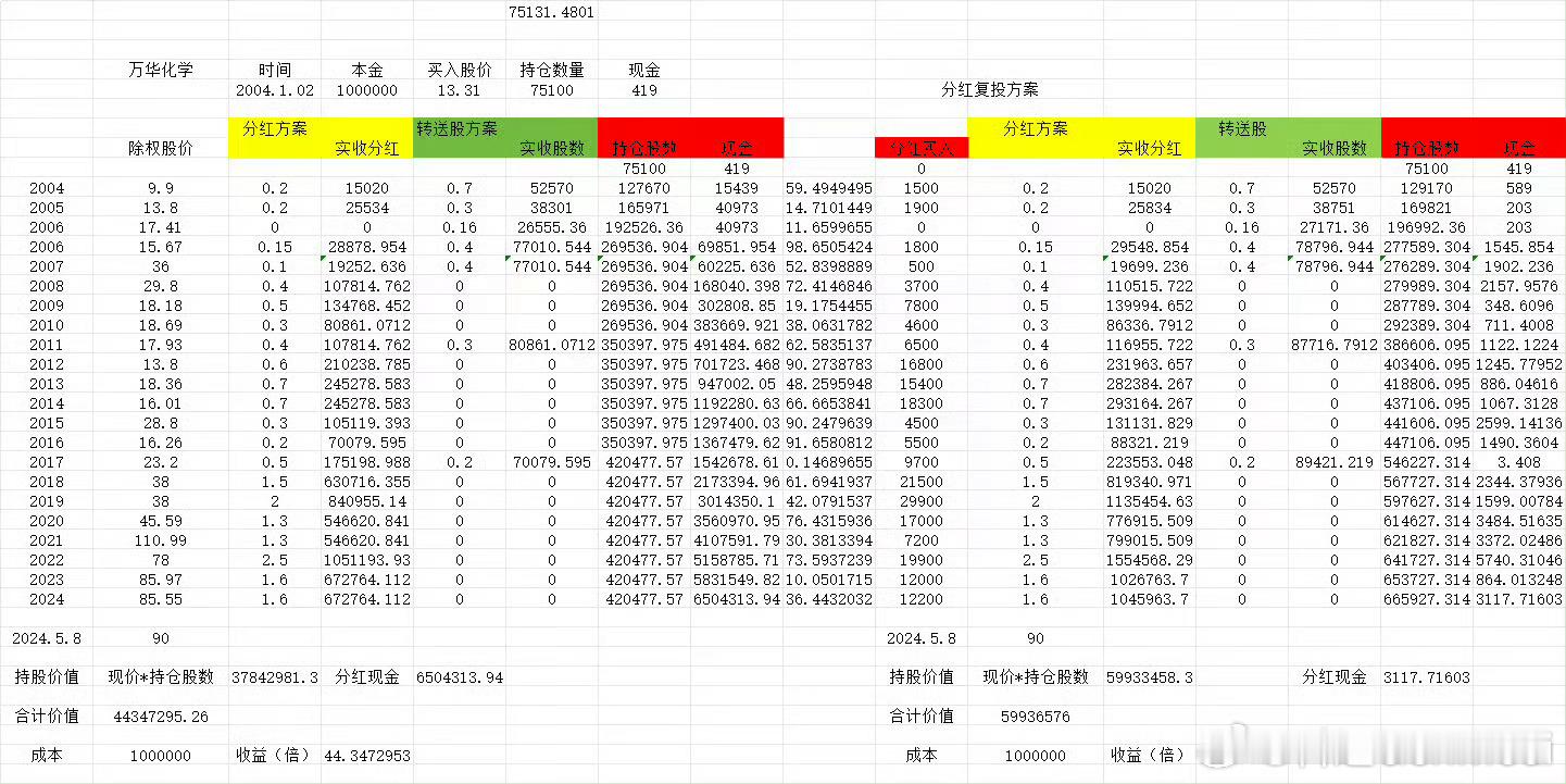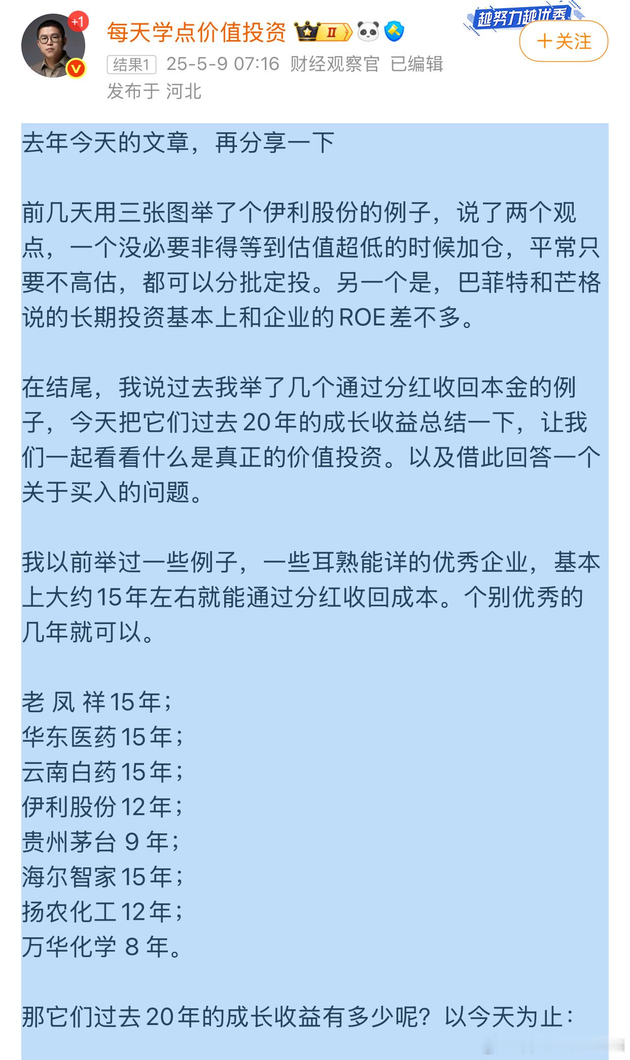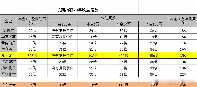 去年今天的文章,再分享一下 伊利实盘十年 前几天用三张图举了个伊利股份的例子,说了两个观点,一个没必要非得等到估值超低的时候加仓,平常只要不高估,都可以分批定投。另一个,巴芒说长期投资基本和企业ROE差不多。在结尾,举了几个通过分红收回本金的例子,今天把它们过去20年的成长收益总结一下,让我们一起看看什么是真正的价值投资。以及借此回答一个关于买入的问题。一些耳熟能详的优秀企业,基本上大约15年左右就能通过分红收回成本。个别优秀的几年就可以。老 凤 祥15年;华东医药15年;云南白药15年;伊利股份12年;贵州茅台 9 年;海尔智家15年;扬农化工12年;万华化学 8 年。过去20年的成长收益有多少呢?以今天为止:老 凤 祥:25倍;华东医药:17倍;云南白药:26倍;伊利股份:30倍;贵州茅台:363倍;海尔智家:27倍;扬农化工:29倍;万华化学:44倍。配图有详细表格。从数据中能看出,在过去20年中茅台的成长收益确实是独一份的,其他企业很难和它相比。在过去的20年当中有很多人借助茅台实现了财富增值,有人说价值投资的尽头就是茅台,但价值投资的尽头并不是茅台,价值投资的尽头是投资人能力圈的边界,出圈就会面临真正的风险。又特地算了一下格力电器,看看格力电器过去20年是不是够意思,结果格力电器过去20年长期持有成长收益85倍,在过去20年还是很够意思的。但是在未来如何?不知道。重要的是大家注意,例子就是例子,是让我们明白什么是真正的价值投资,以及长期持股有什么意义,并不推荐股票。至于举例子的企业未来如何,大家要自己思考。这里普及一下复利,大家借此思考一下在价值投资当中,如果一个亿是你的小目标,你应该在哪里更努力。时间?收益率?本金?100倍,30年时间,复合收益率需要16%;1000倍,30年时间,复合收益率需要25%;10000倍,30年时间,复合收益率需要35%;100倍,40年时间,复合收益率需要12%;1000倍,40年时间,复合收益率需要18%;10000倍,40年时间,复合收益率需要25%;100倍,50年时间,复合收益率需要9%;1000倍,50年时间,复合收益率需要14%;10000倍,50年时间,复合收益率需要20%;100倍,60年时间,复合收益率需要8%;1000倍,60年时间,复合收益率需要12%;10000倍,60年时间,复合收益率需要16%。10万倍收益,30年需要复合收益率46%,40年需要复合收益率33%,50年需要25%,60年需要21%。这里说一下,这个计算表格的公式设置现在基本达到半自动了,只改动其中几个变量就能实现自动计算结果。最后,借此回答一个什么样的买入问题呢?优秀企业可以在价格合理时买入,不用非等低估。有很多小伙伴说,不对,买了一年了下跌了50%,肯定买错了,买的高了。实际上你只是看见现在的价格回撤了50%,你可以用除权的价格回看20年前,那时候买入回撤50%也比比皆是,如果你现在用前复权去看那些回撤,都已经快成一条平线了。所以重要的是你要选择优秀的企业,能够不断地成长,再过20年,你现在的50%的回撤也什么都不是。你说我做不到,那你就不要做投资了,投资这件事不适合你。另外再回答一个问题,当初你是10块买还是20块买并不重要,当股价到达100块钱的时候,重要的是你买没买,手里有没有股数。