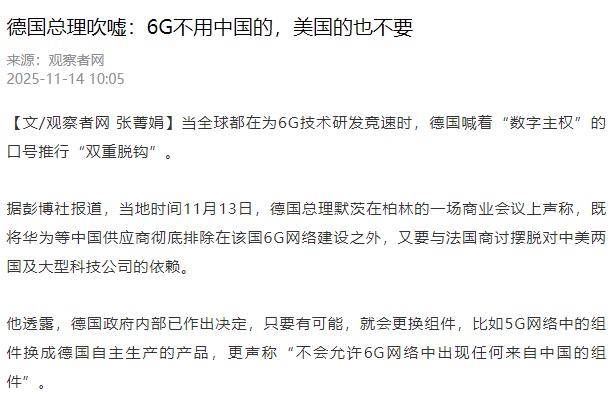 11月13日,德国总理默茨公开表示,绝不会允许由中方生产的组件进入德国未来的6G网络建设中来。 默茨的这番表态,显然是要把技术问题捆上政治的战车。而有意思的是,他还表示美国生成的组建也不要,说要和法国一起在6G网络建设中摆脱对中美的依赖。这话听着豪情万丈,仔细琢磨下倒有点像没算清家底就拍胸脯的味道。 欧洲自家的伽利略卫星导航系统,当初也是喊着要技术自主,结果从计划启动到正式开通足足晚了8年,期间还闹出原子钟故障、地面控制中心瘫痪的幺蛾子,28颗卫星的星座布局拖了十几年才勉强成型。 而6G可比卫星导航系统复杂的多,涉及卫星通信、AI融合、网络切片等一堆前沿技术,德国现在连个能拿得出手的本土通信巨头都没有,难道指望西门子突然转行做基站? 技术专利更是硬通货,5G时代中国企业的专利占比就超过了40%,华为、中兴在标准制定里的话语权可不是靠嘴说出来的。到了6G研发,中国去年就已经在十几个城市开展了试验网建设,卫星互联网和地面网络融合的技术路线都快跑通了。 可整个欧盟去年推出的6G旗舰计划预算也才12亿欧元,分摊到德国头上甚至没几个钱,这点经费连建个像样的实验室都够呛。 更有意思的是,欧洲通信设备市场早就被诺基亚和爱立信垄断,可这两家去年的研发投入加起来还不到华为的三分之一,真要靠他们跟中美竞争,怕是连喝汤都赶不上热的。 通信网络这东西从来就不是闭门造车能搞成的,当年5G建设德国还偷偷留了华为的后门,现在嘴上说不要中美组件,真到实际施工的时候就知道麻烦了。 6G的核心组件比如毫米波芯片、光传输模块,全球能稳定供货的厂商掰着手指头都能数过来。排除中国企业意味着德国的建设成本至少要涨三成,工期还要往后拖,再把美国一扔就几乎是从零开始。等到德国自己建设出6G网络来了,怕是世界都进入7G甚至是8G时代了。 德国这种把技术安全当政治秀的操作,最后耽误的还是自己家企业的数字经济转型。 现在连汽车厂急需更低时延的6G网络来为自动驾驶打底子,中美各自也都在这一领域发力,真等别的国家都用上了,德国企业怕是要集体喊救命了。
