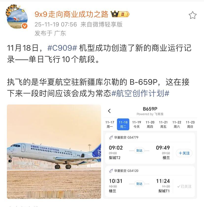 11月18日,C909机型成功创造了新的商业运行记录——单日飞行10个航段! 早班机从早上9点开始到凌晨1点多结束,充分将C909最大的性能给发挥了出来,飞机只有这样飞才能挣到钱,而且这样飞有好处,就是很多原本不坐飞机的人也会选择坐飞机,因为航班非常的密集。 特别对于新疆这种地广人稀的地方来说,城市与城市之间又非常远,坐飞机是最适合的,有时候比坐火车还要便宜。 各位是怎么看的?欢迎评论区留言。