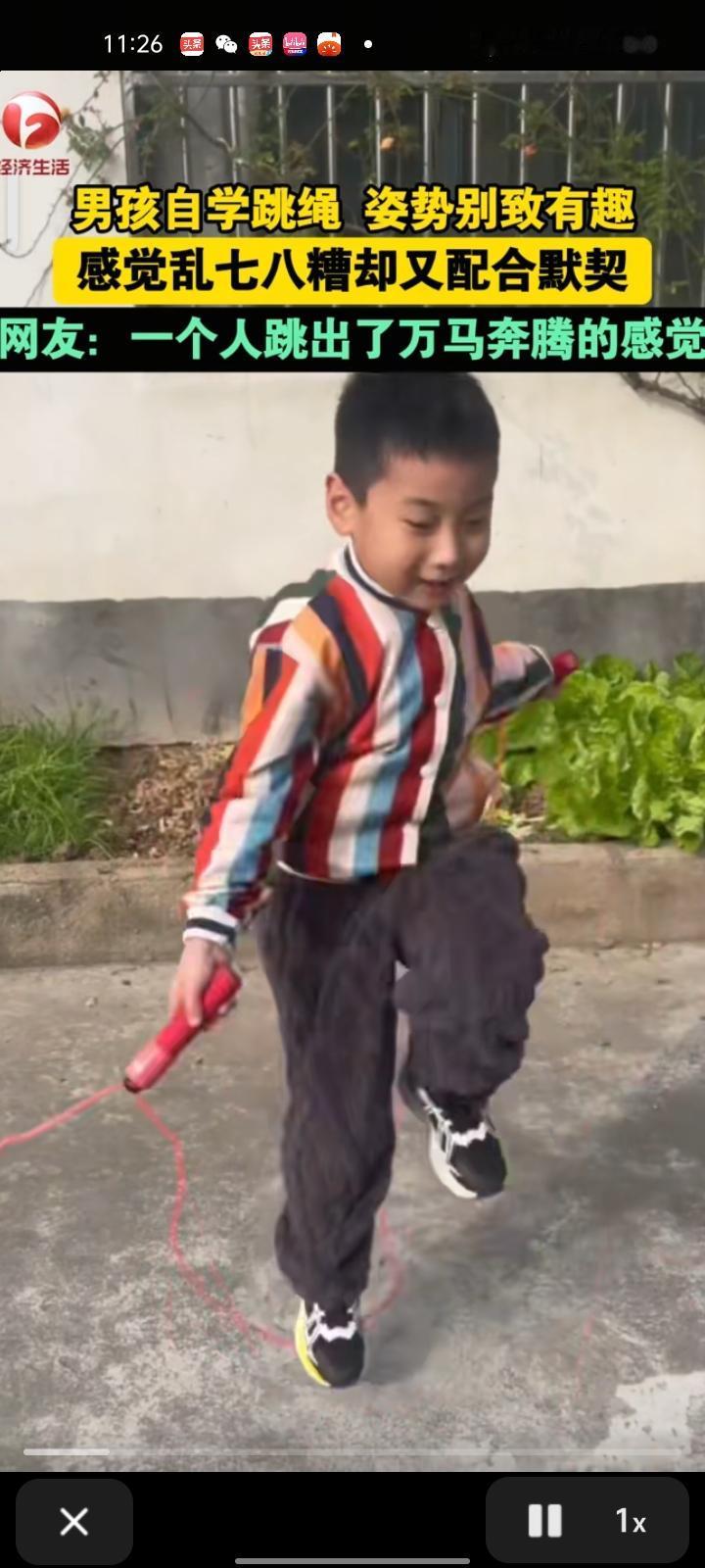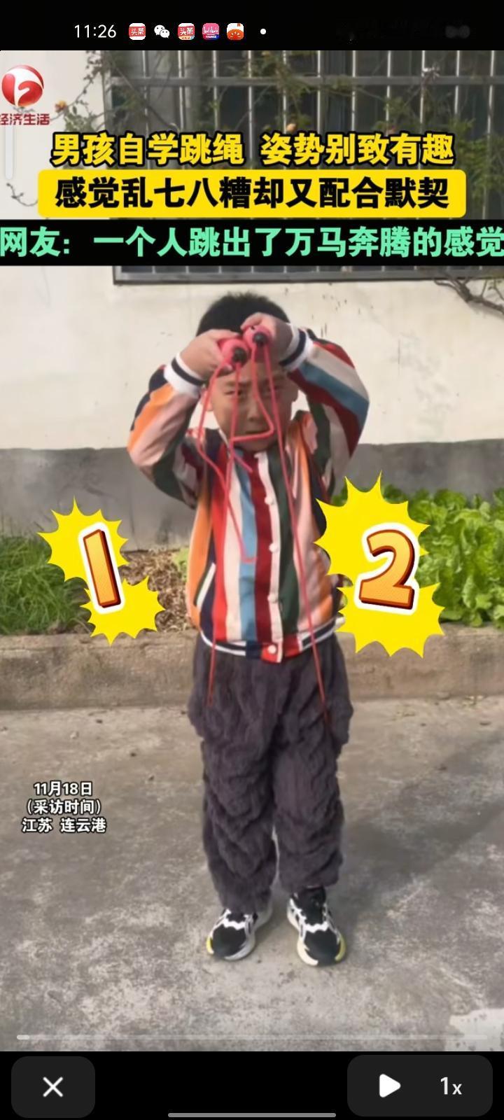 11月15日,江苏连云港。男孩在家自学跳绳,姿势别致又有趣,跳出了万马奔腾的感觉。 孩子妈妈徐女士表示,最近学校里有幼儿园打卡跳绳,一开始他不会跳,跳了几天就会跳了,没人教他,感觉特别有趣。