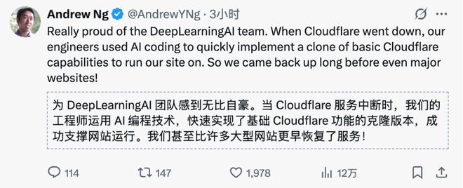 比如,吴恩达团队就在Cloudflare宕机的过程中,用AI快速实现了Cloudflare功能的克隆版本,成为最早一批恢复运行的网站。