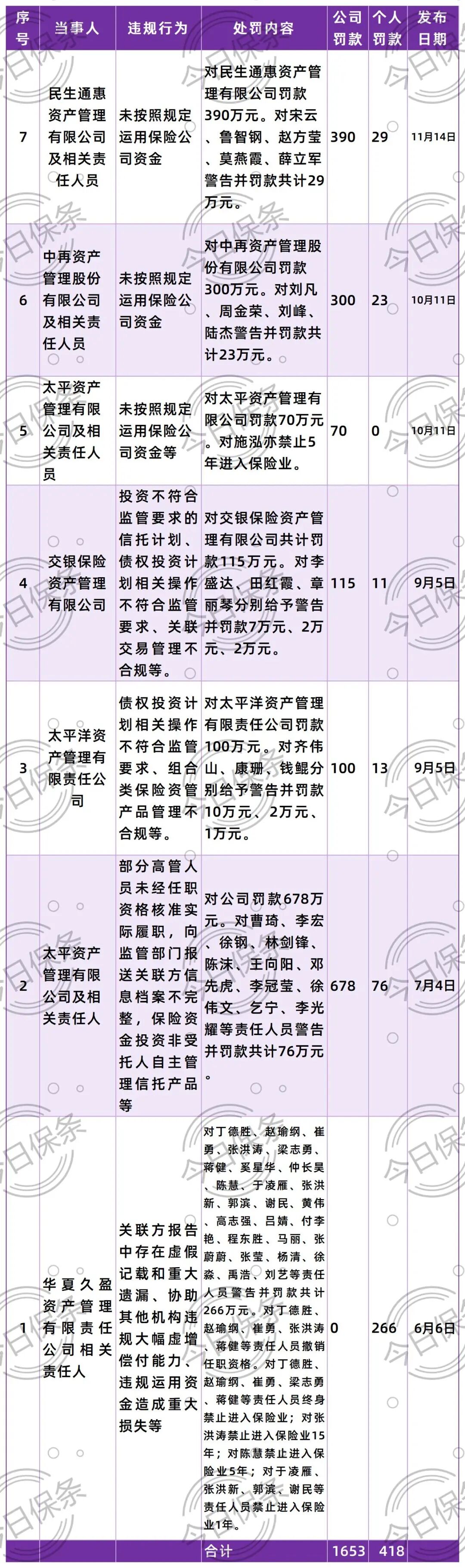 这是今年第7家领到罚单的保险资产管理公司。今年以来的保险资管公司领到的罚单金额累计2071万,其中公司罚款1653万,个人罚款418万。