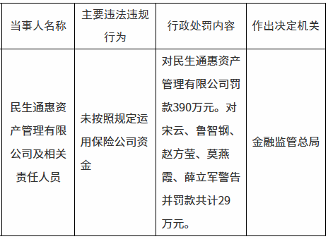 11月14日,国家金融监督管理总局发布行政处罚信息显示,民生通惠资产管理有限公司被罚款390万元。相关责任人被罚款29万元。违规事由是“未按照规定运用保险公司资金”。