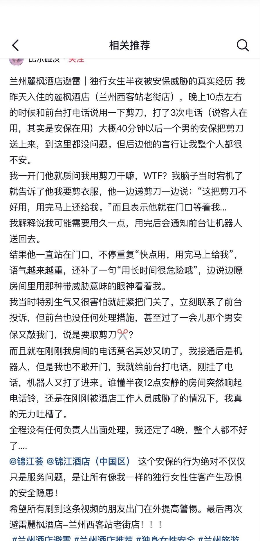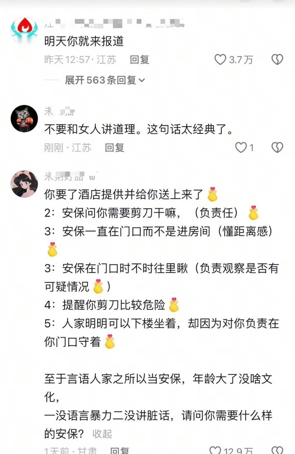 女子吐槽:入住兰州一家酒店,问前台要剪刀剪衣服,遭高大男保安深夜守在门口质问:“