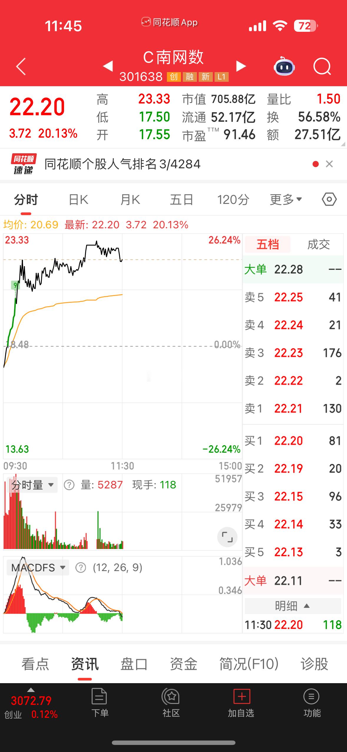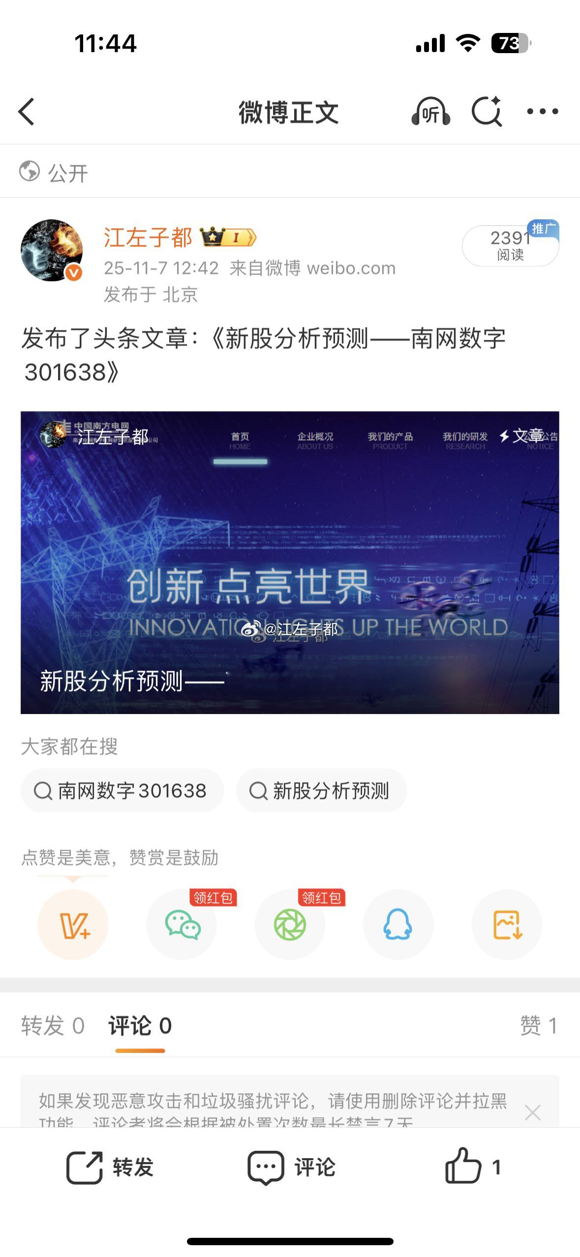 哎呀卧槽,太不敏感了!错过大肉啊!早上起来看到一条奇怪的通知,有微博被投诉了,点进去一看,大为震惊,是关于新股南网数字的分析,一篇分析新股的文章有啥好投诉的呢?好纳闷!结果呢,今天新股c南网大涨20%多了,中间还有一次临停!!我太傻了,这是主力给我送钱我放弃了啊,今天他们要拉这个票啊,所以把一切“负面”的信息全部投诉关了不显示啊…………至于文章里说啥了,其实啥都没说,就提了一句,这个发行估值和同行比可能不算太便宜……