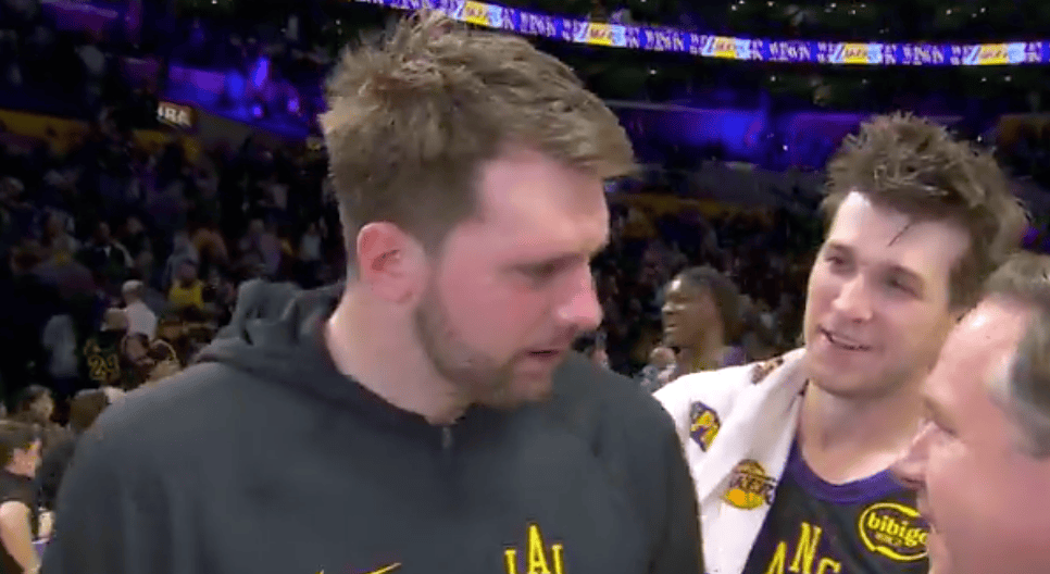 赛后,湖人后卫卢卡-东契奇在场边接受采访,期间队友奥斯汀-里夫斯过来拍了拍东契奇,并对他说道:”干得不错,朋友。“