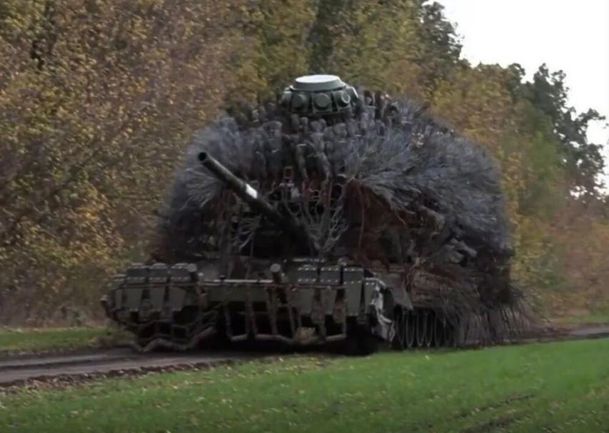 俄军坦克这才是,在“抄袭”永乐大典啊!整个坦克上插满了“狼筅”,完全的防御力!还有作用于藤牌一样的复合装甲,担任长矛认为的主炮! 俄军现在,也是打明白了,坦克炮塔转来转去的也没用。因为,根本就没有坦克大战了,现代战争不存在坦克对射了。 坦克现在,就一个作用,就是突破无人机和地雷的密集打击。冲到前线,根据侦察无人机指示目标,利用主炮轰击敌人火力点,掩护俄军突击步兵小组渗透攻击。 明朝抗倭战争,明军惧怕,倭寇武士刀劈开!《倭变事略》记"贼斫一刀,十数枪齐折,兵皆徒手而奔。" 所以戚继光将军才发明了狼筅这种大竹仗武器,克制和限制倭寇锋利的武士刀。现在,俄军则是被乌军FPV无人机打得损失惨重,开始利用各种大硬树枝子堆满坦克,限制和破解乌军的FPV无人机攻击。