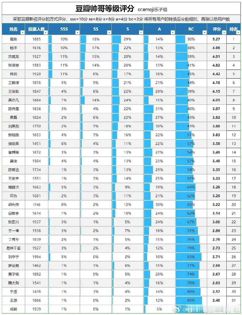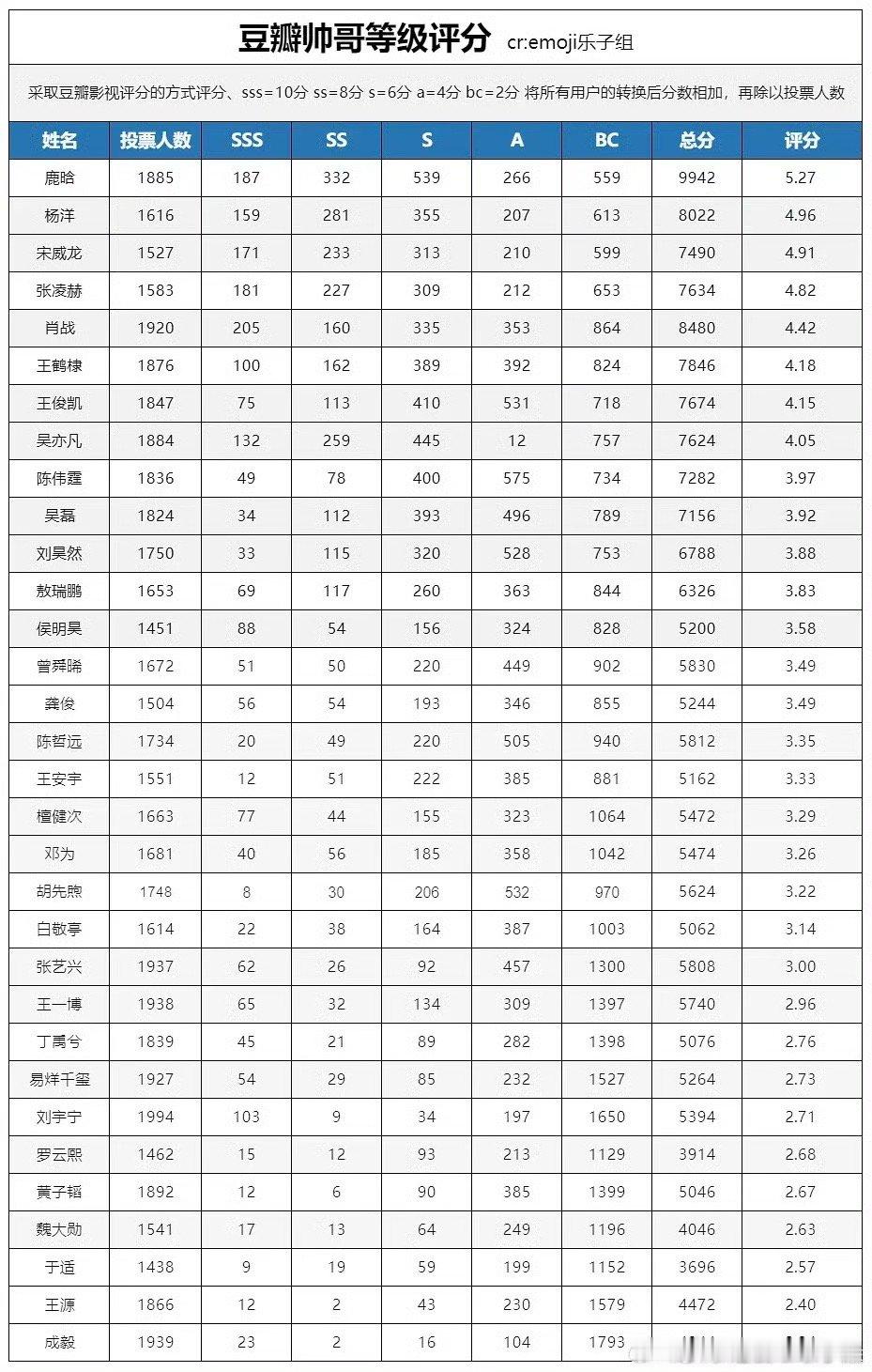 网友总结的内娱帅哥评分表来了前七名分别是:鹿晗 杨洋 宋威龙 张凌赫 肖战 王鹤