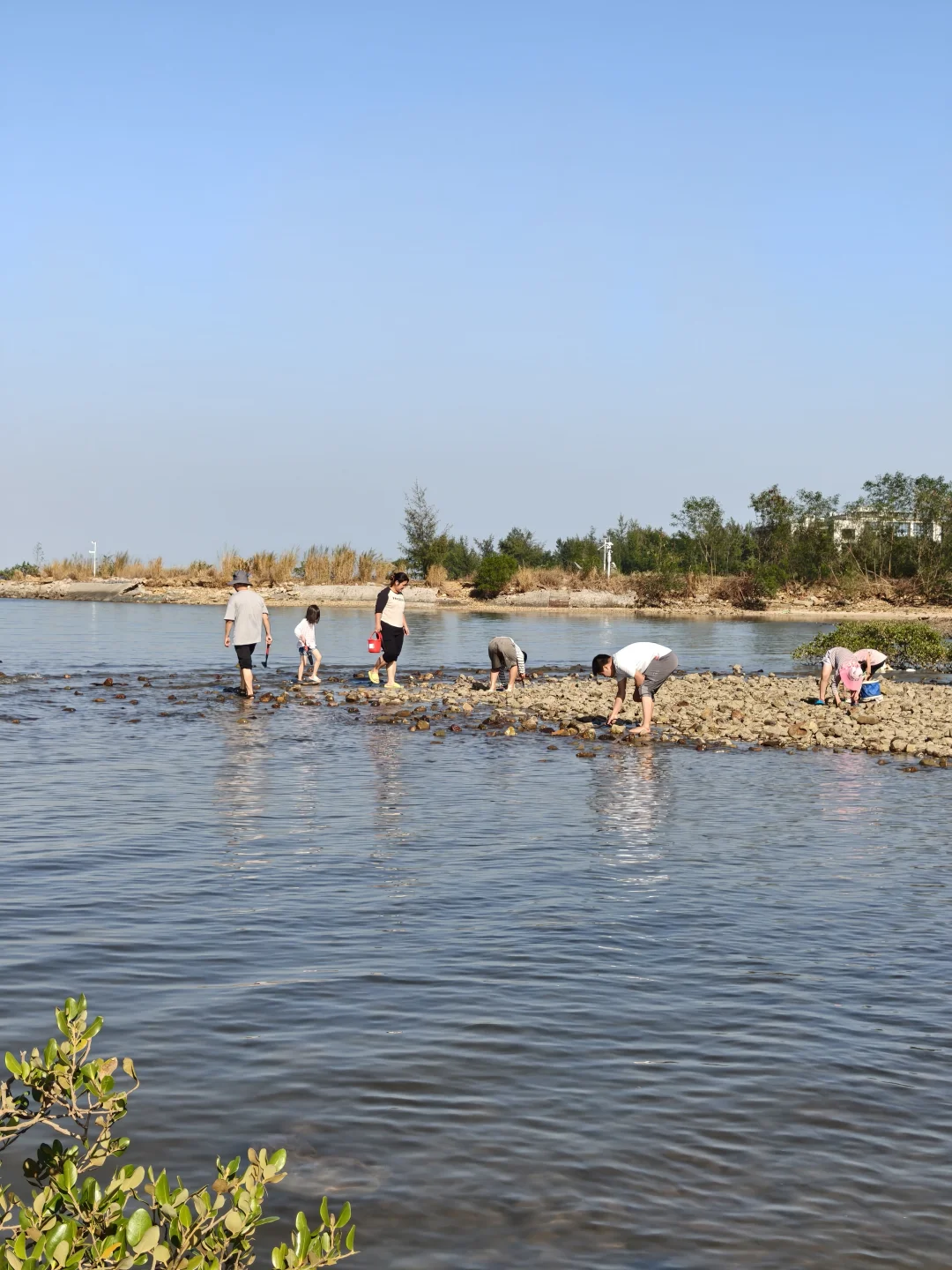 从公园入口右转走 10 分钟,下滩涂就是赶海区!花蛤找沙滩上的小气孔,挖 5cm 就有;小螃蟹藏在礁石缝,用耙子轻轻扒,别用手抓(会夹人);蛏子撒点盐就会钻出来,超有意思~