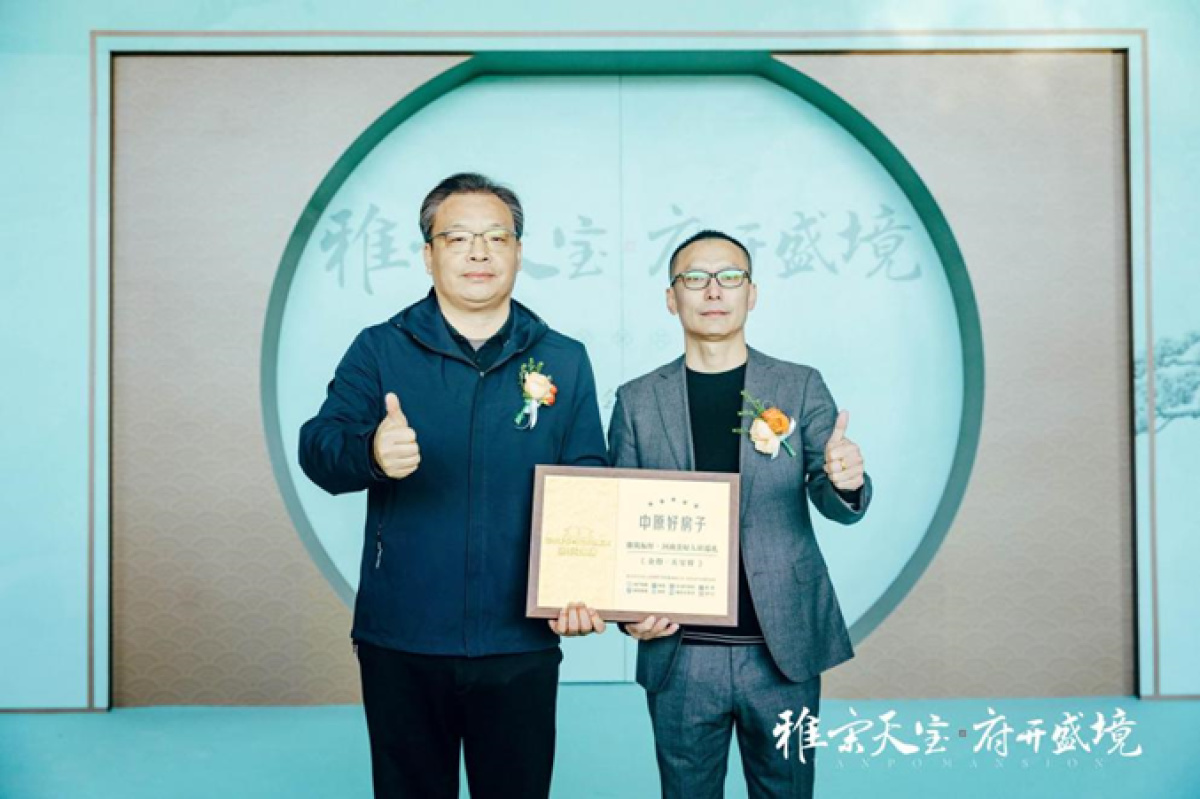 话音未落,奖牌已至。盛典之上,郑州网络空间安全协会党支部书记、郑州主流地产自媒体代表申继东先生,为天宝府营销负责人蔡鹏先生颁发“中原好房子”荣誉奖牌!这枚沉甸甸的奖牌,既是对项目匠心品质的认可,更是对其宋韵美学表达的最佳褒奖。
