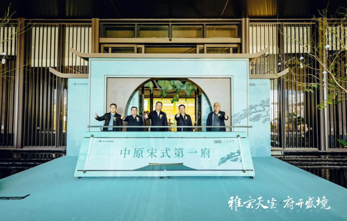 天宝风华,盛势启幕!伴随着郑州市金水科教园区党工委书记/管委会主任李明刚先生、郑州市金水区人民政府副区长刘明辉先生、郑州市金水区北林路街道办事处党工委书记石中亮先生、郑州金水投资集团党委书记/董事长徐工先生、华润置地郑州公司投资总经理郭红奎先生等五位领导嘉宾共同按下启动键,宋式府门缓缓开启,光影流转间,金投·天宝府宋风美学会所正式揭开神秘面纱。这一刻,掌声与光韵交织,为这场风雅盛典写下圆满注脚。