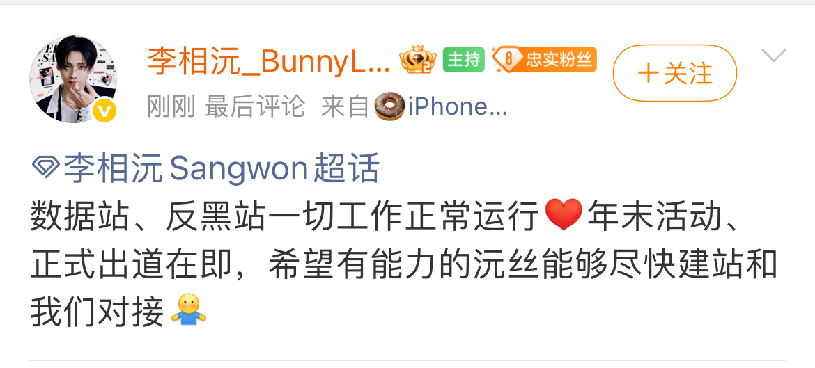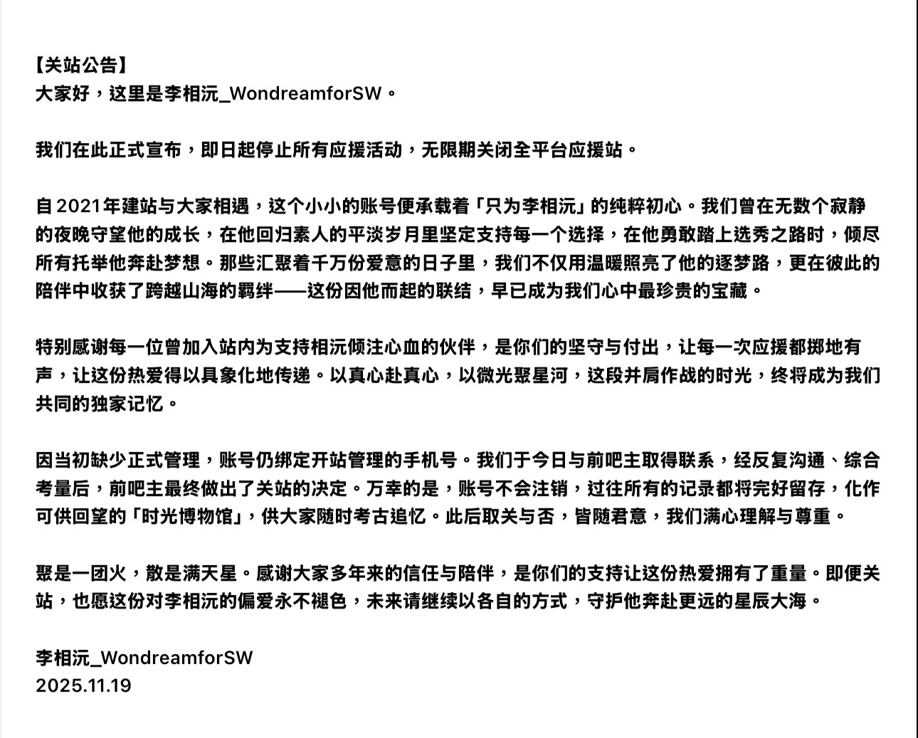 李相沅大吧宣布关站,停止所有应援活动数据站、反黑站工作正常运行🔖
