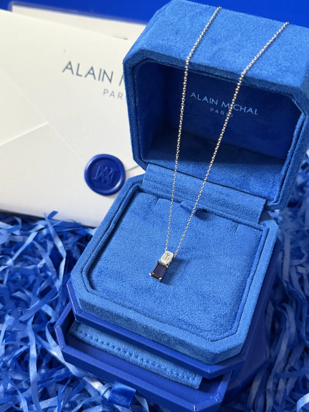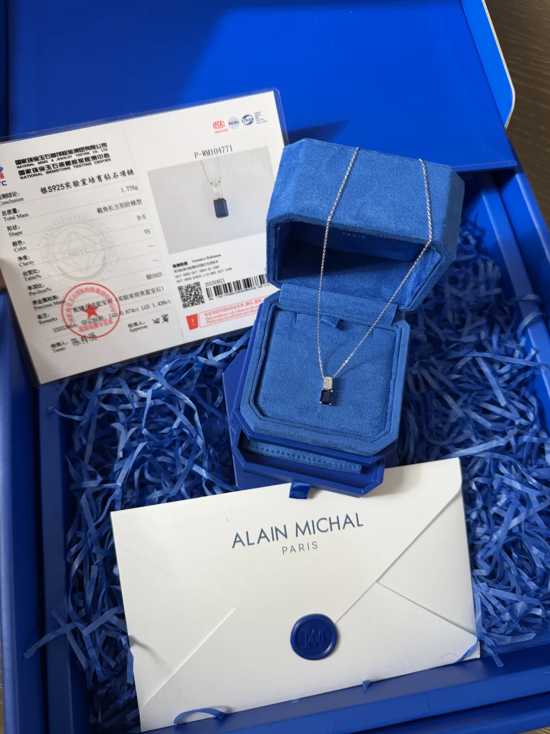 谁能拒绝Alain Michal这颗2克拉蓝宝石培育钻项链啊! 梯形白钻衬着蓝宝石,清冷感混着深邃调,像把银河碎在颈间。活动卡扣特灵动,走起来宝石轻轻晃,像把星光锁在了脖子上✨银镀金材质很有质感,配针织衫温柔,搭西装又飒,风格随便换都能hold[萌萌哒R] 丝绒蓝盒子一打开仪式感拉满,还有检测证书,现在真的天天想戴,完全长在我审美上,超喜欢💙