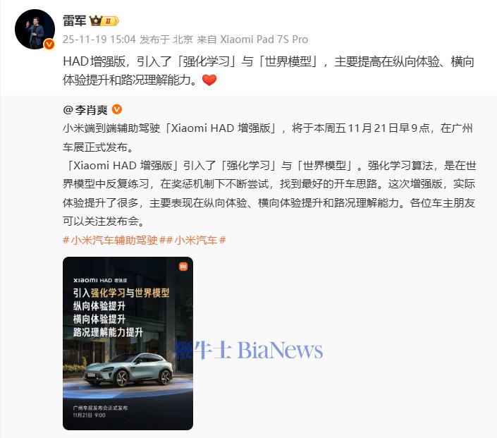 昨日,雷军发文称,11月21日上午9点广州车展上,小米汽车副总裁李肖爽将向大家发布小米端到端辅助驾驶新版本——HAD增强版。